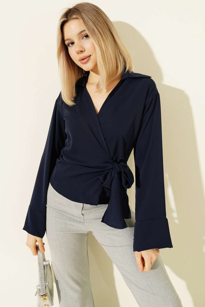Yanı Kuşak Bağlamalı Kısa Gömlek Lacivert