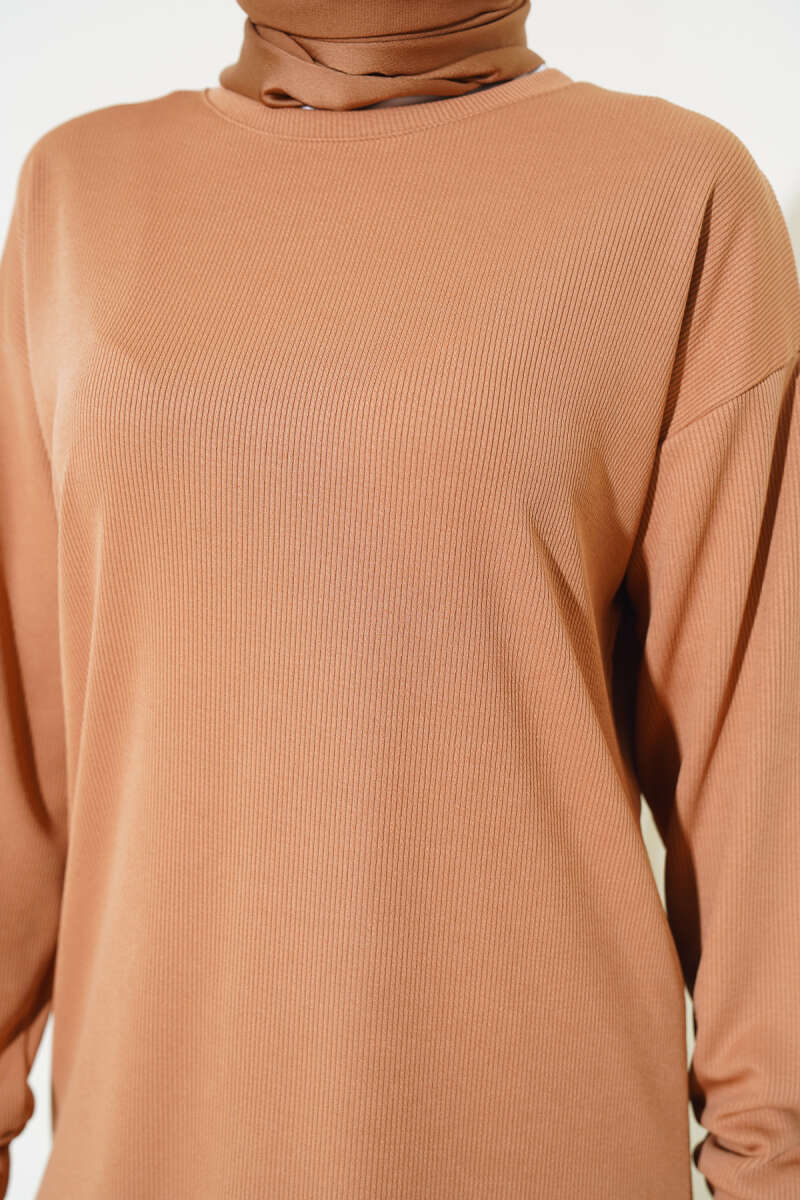 Çizgi Garnili Bisiklet Yaka Loyşa İkili Takım Bej
