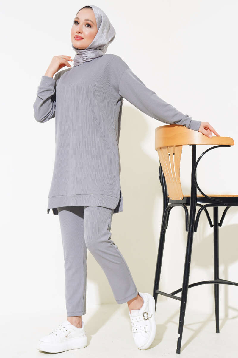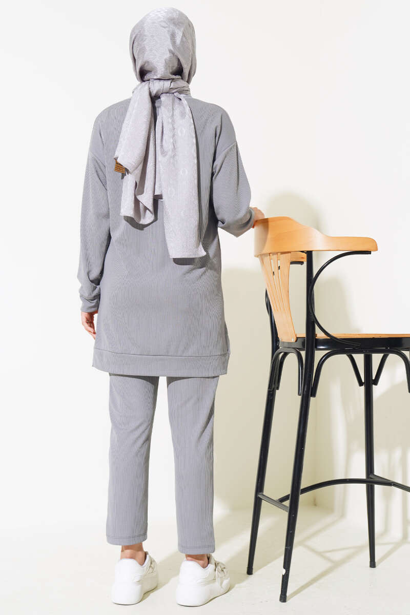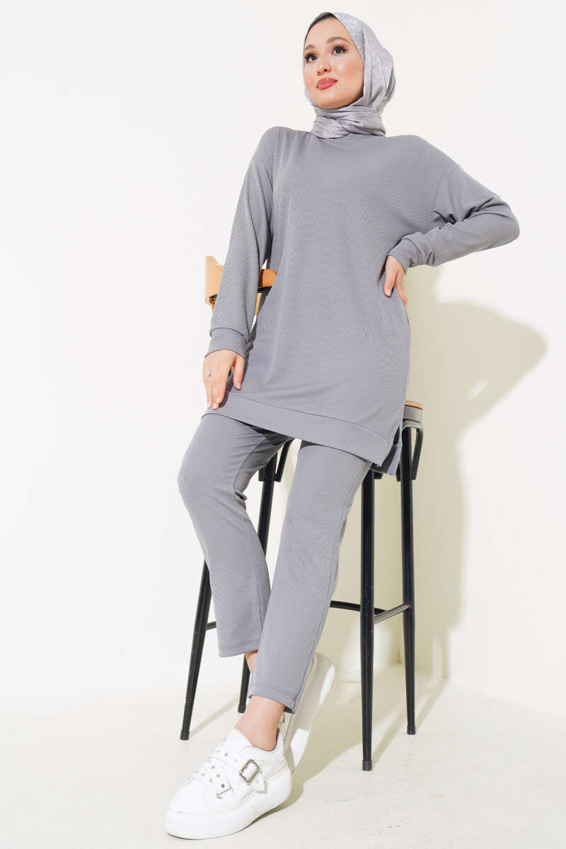 Çizgi Garnili Bisiklet Yaka Loyşa İkili Takım Mürdüm