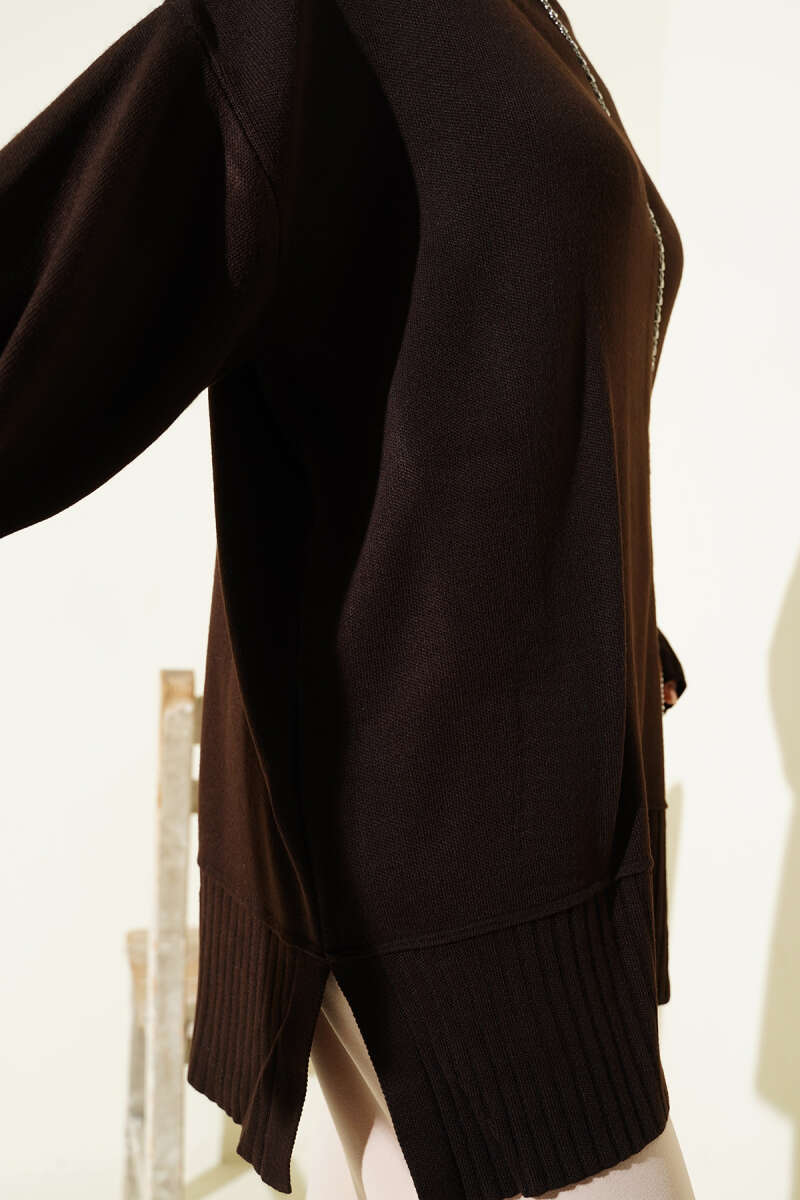 Yanı Yırtmaçlı Oversize Triko Tunik Kahve