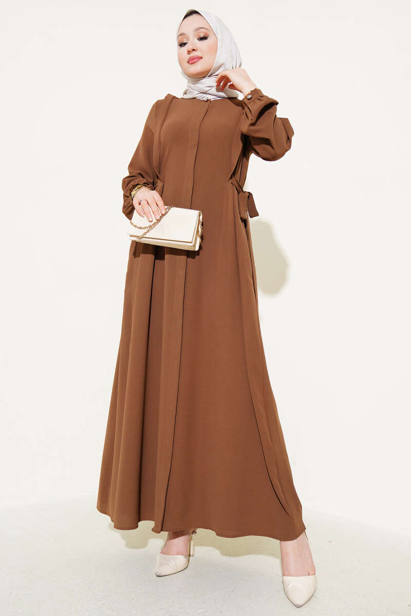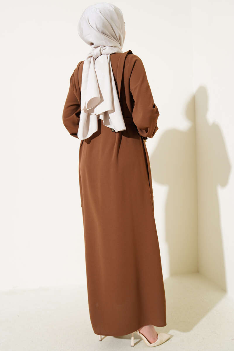 Yanları Bağlamalı Boydan Düğmeli Elbise Taba