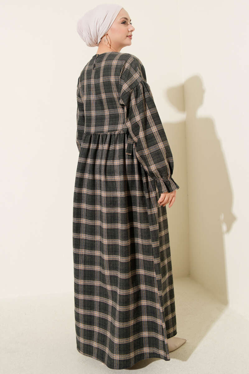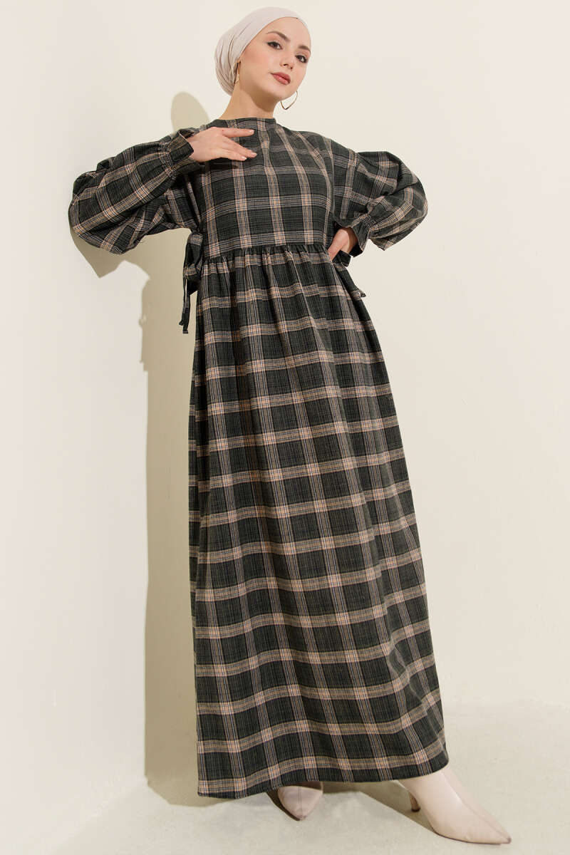 Yanları Bağlamalı Ekoseli Elbise Haki