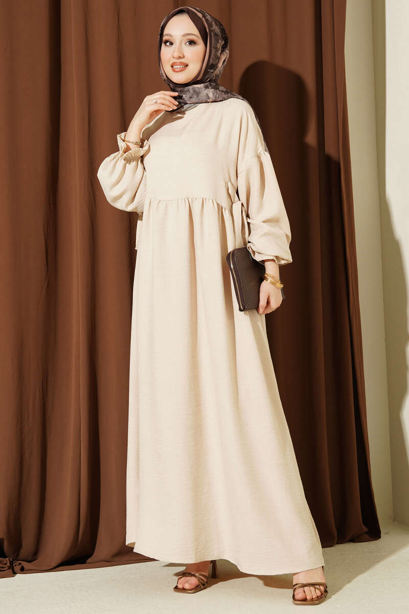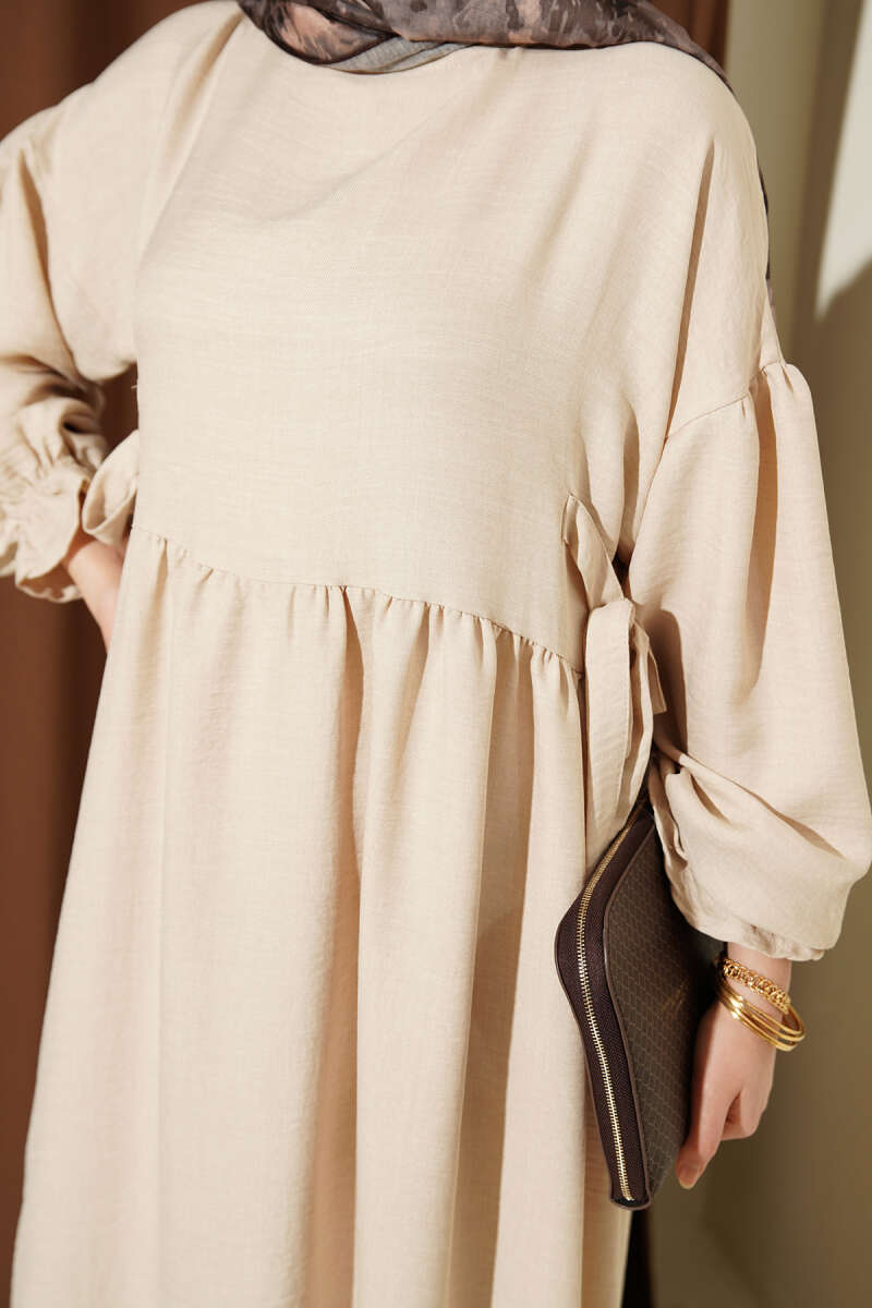 Yanları Bağlamalı Kloş Elbise Bej