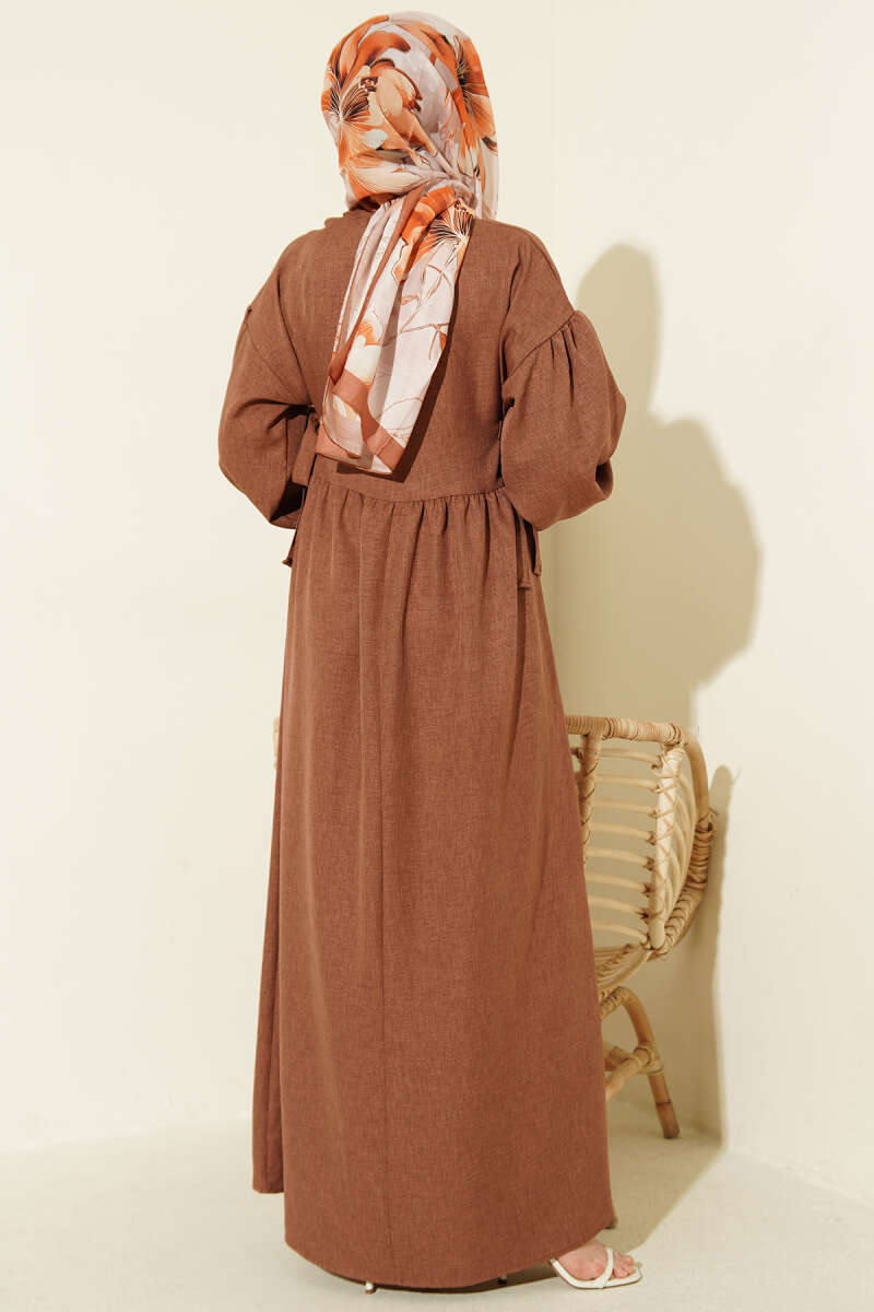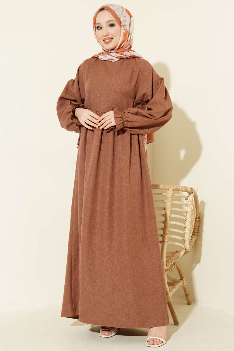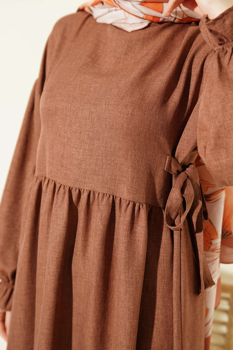 Yanları Bağlamalı Kloş Elbise Kahve