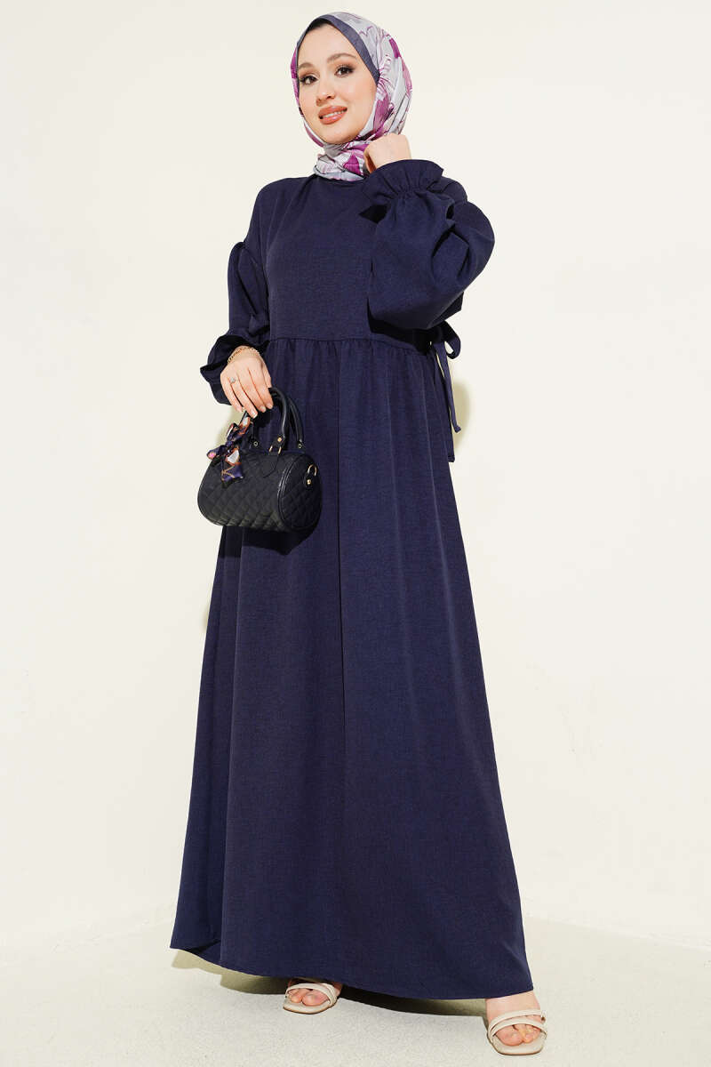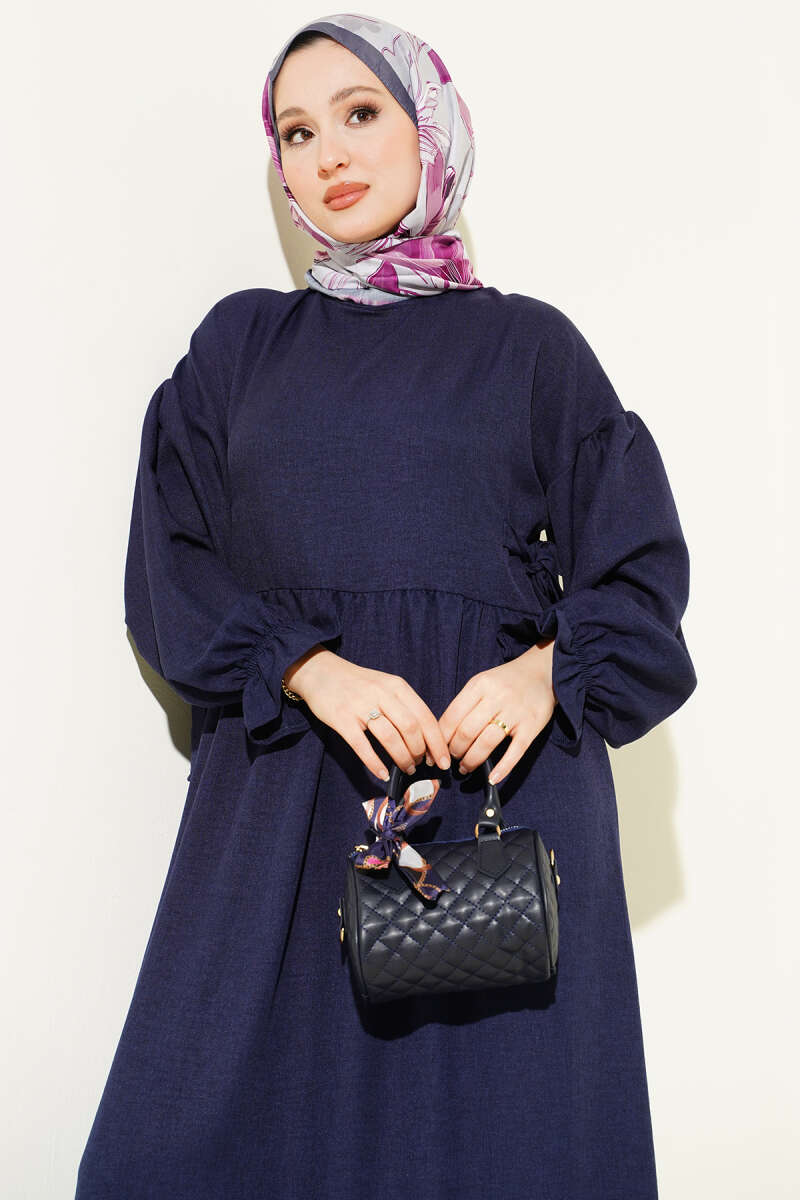 Yanları Bağlamalı Kloş Elbise Lacivert