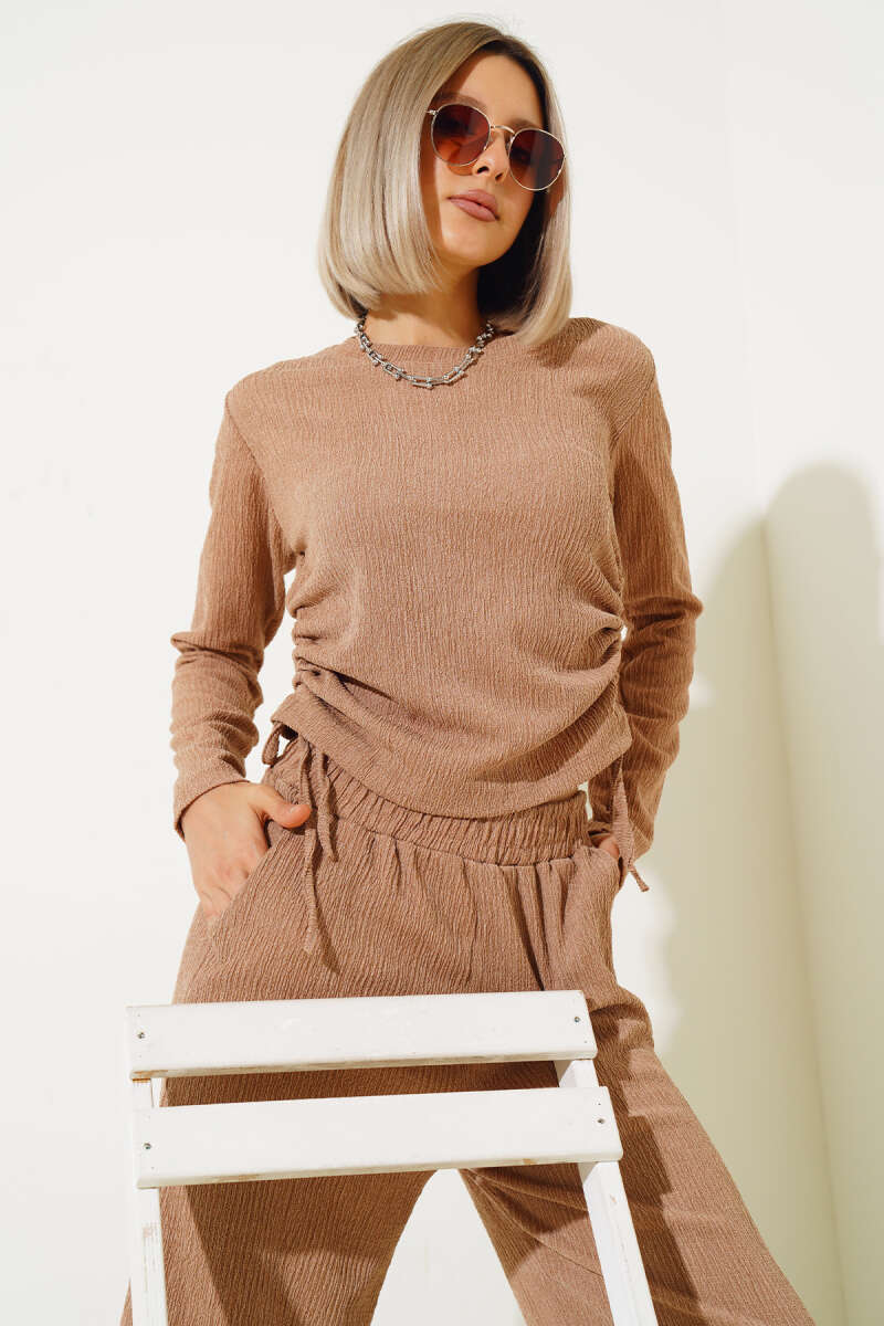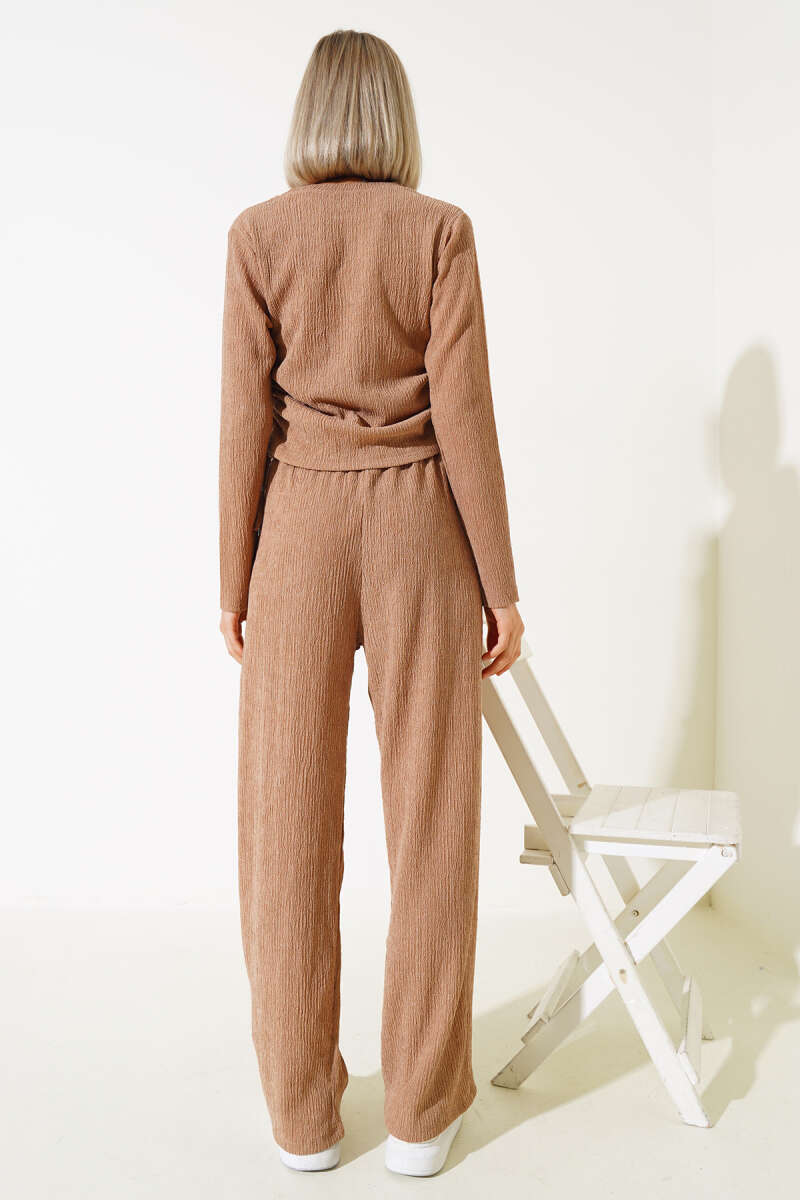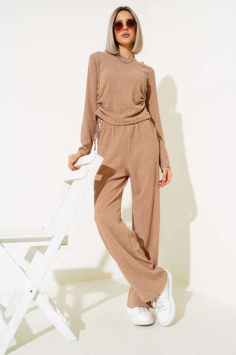 İspanyol Paça Bel Lastikli Dabıl Pantolon Acı Kahve