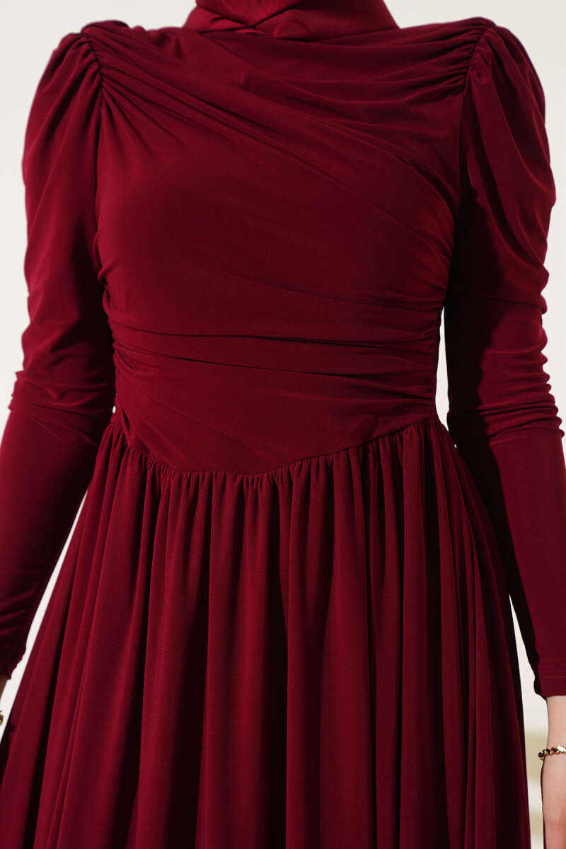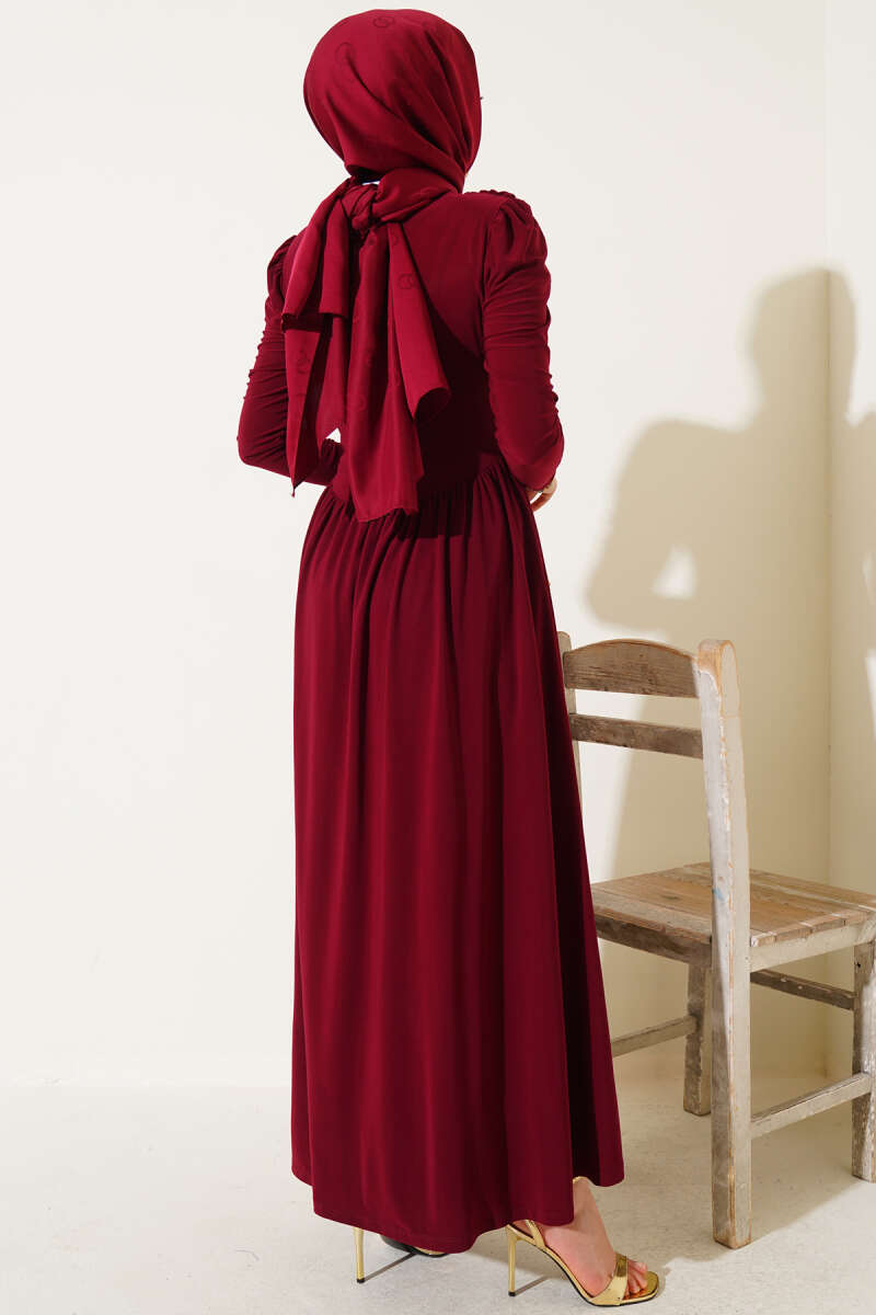 Düğmeli Tensel İnce Kemerli Elbise Bordo