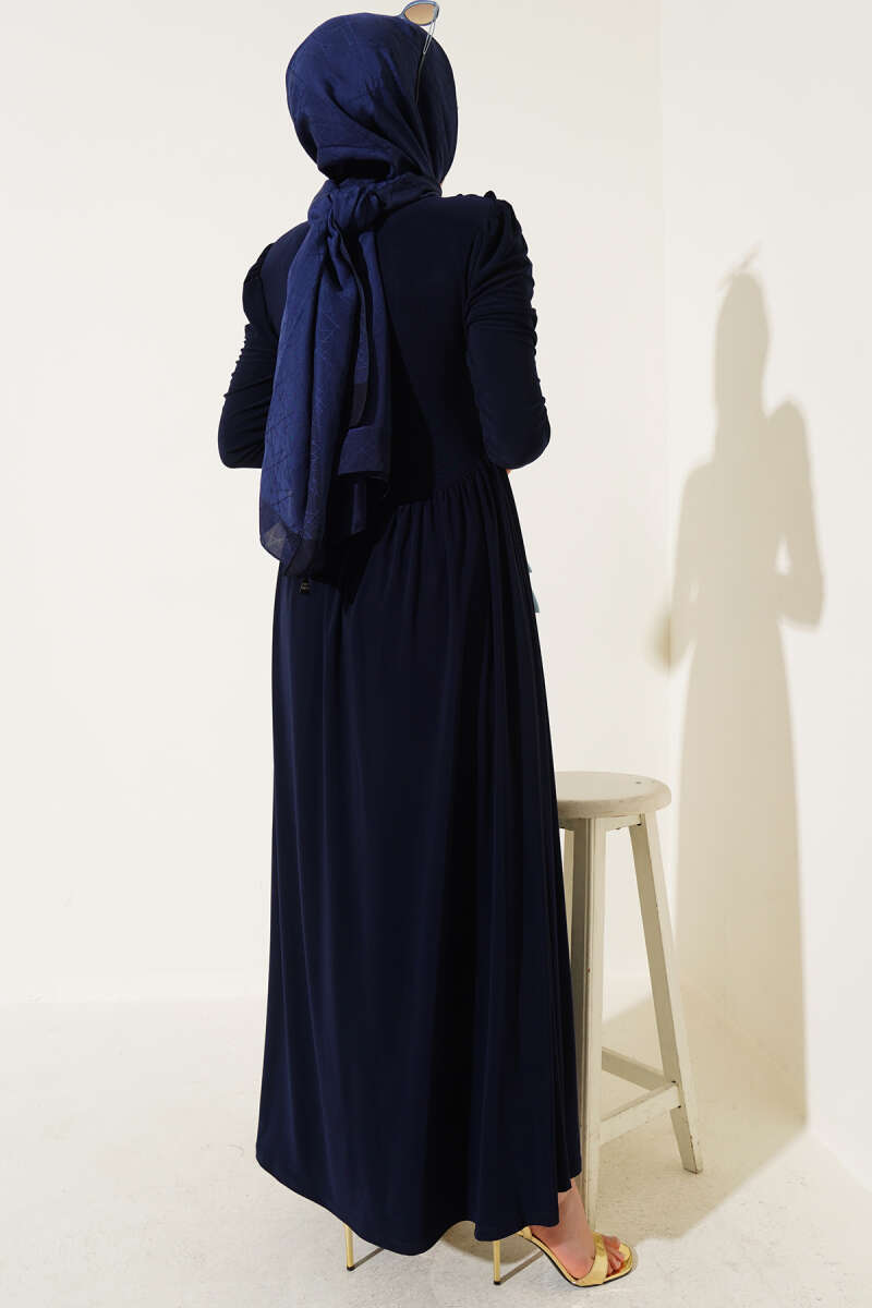 Düğmeli Tensel İnce Kemerli Elbise Lacivert
