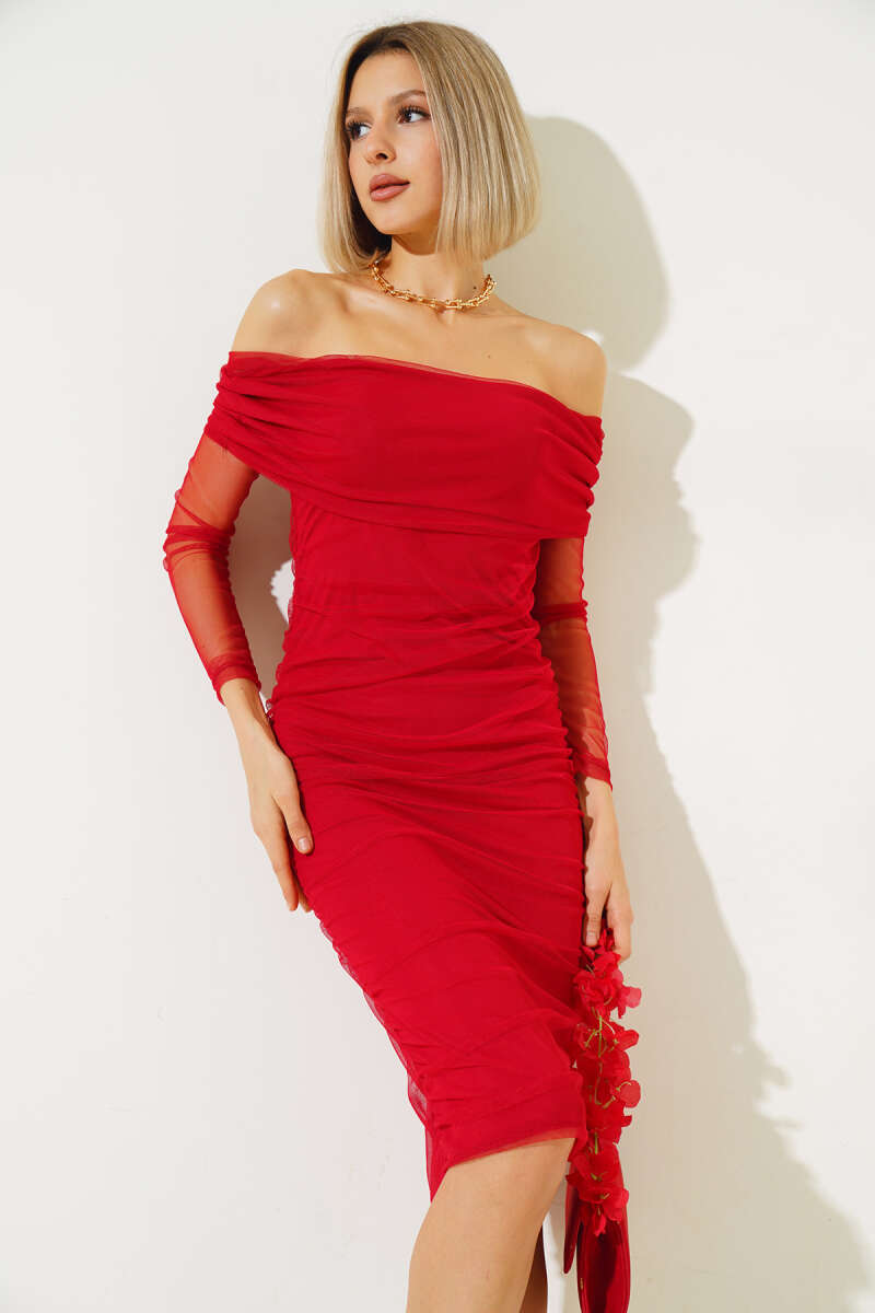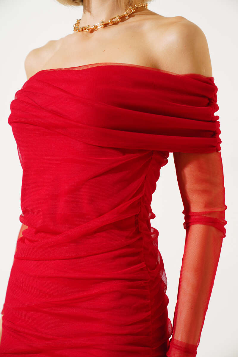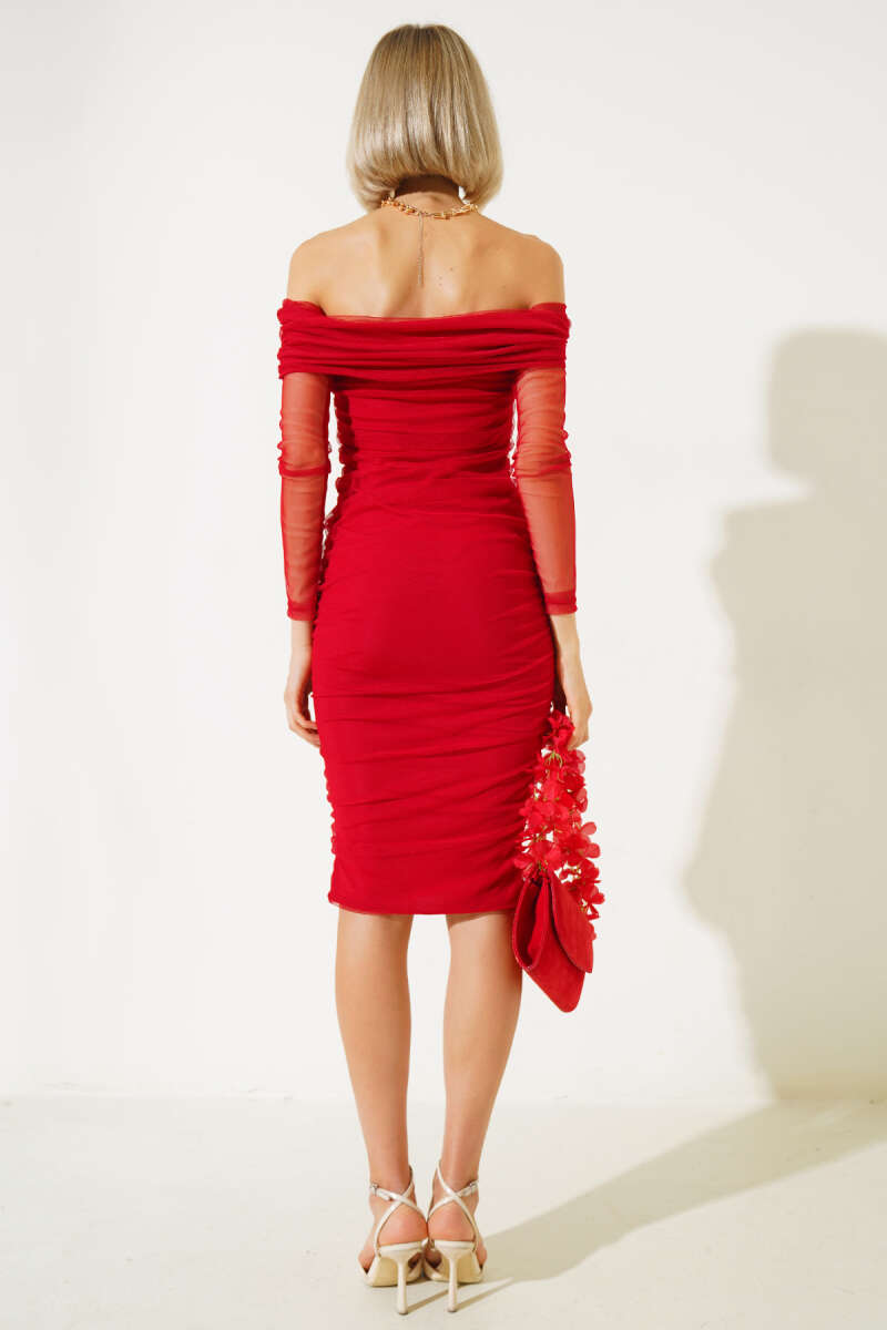 Yanları Büzgülü Tül Midi Elbise Kırmızı
