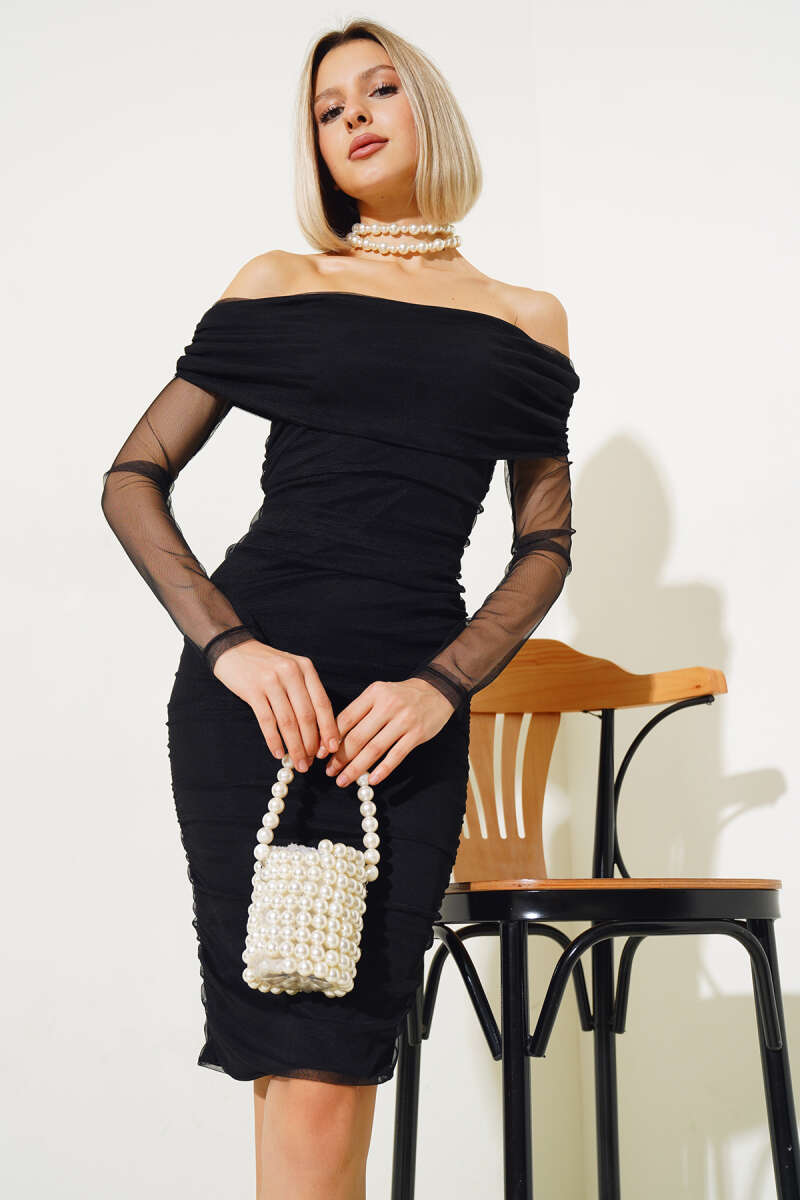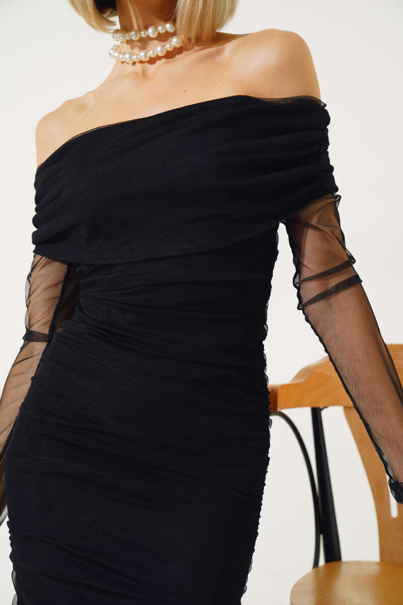 Yanları Büzgülü Tül Midi Elbise Siyah