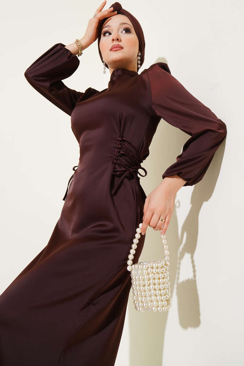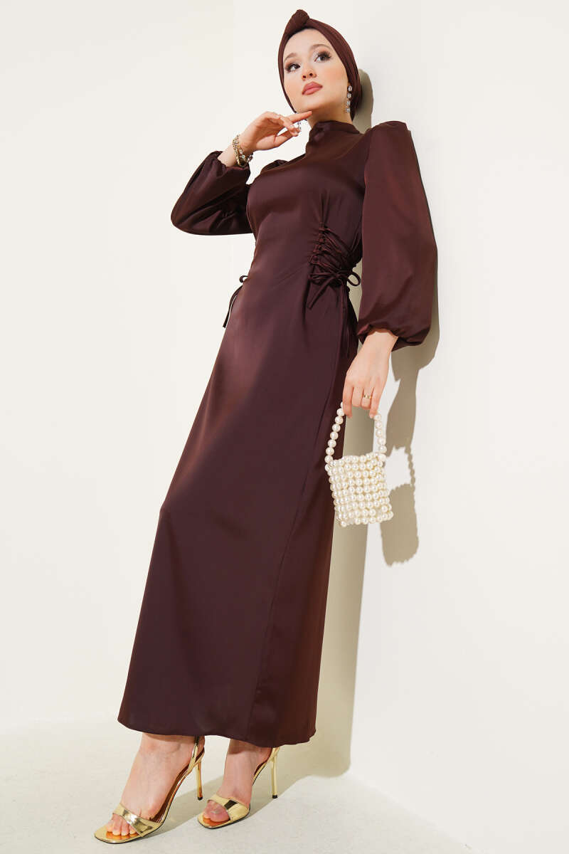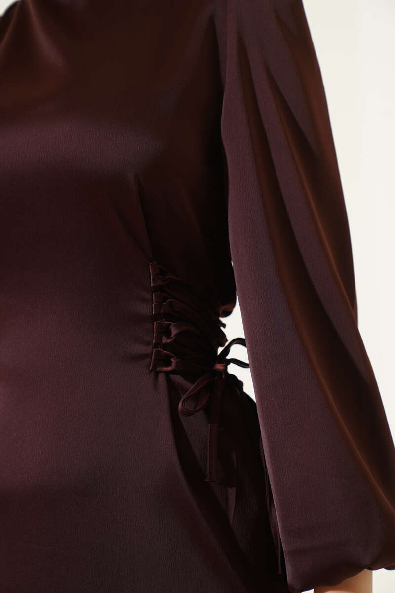 Ajurlu İp Kuşaklı Triko Elbise Kahve
