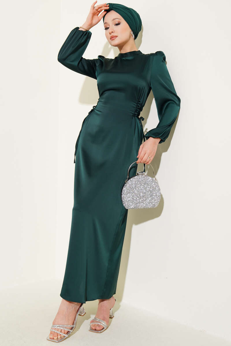 Yanları Çapraz İp Bağlamalı Saten Elbise Zümrüt