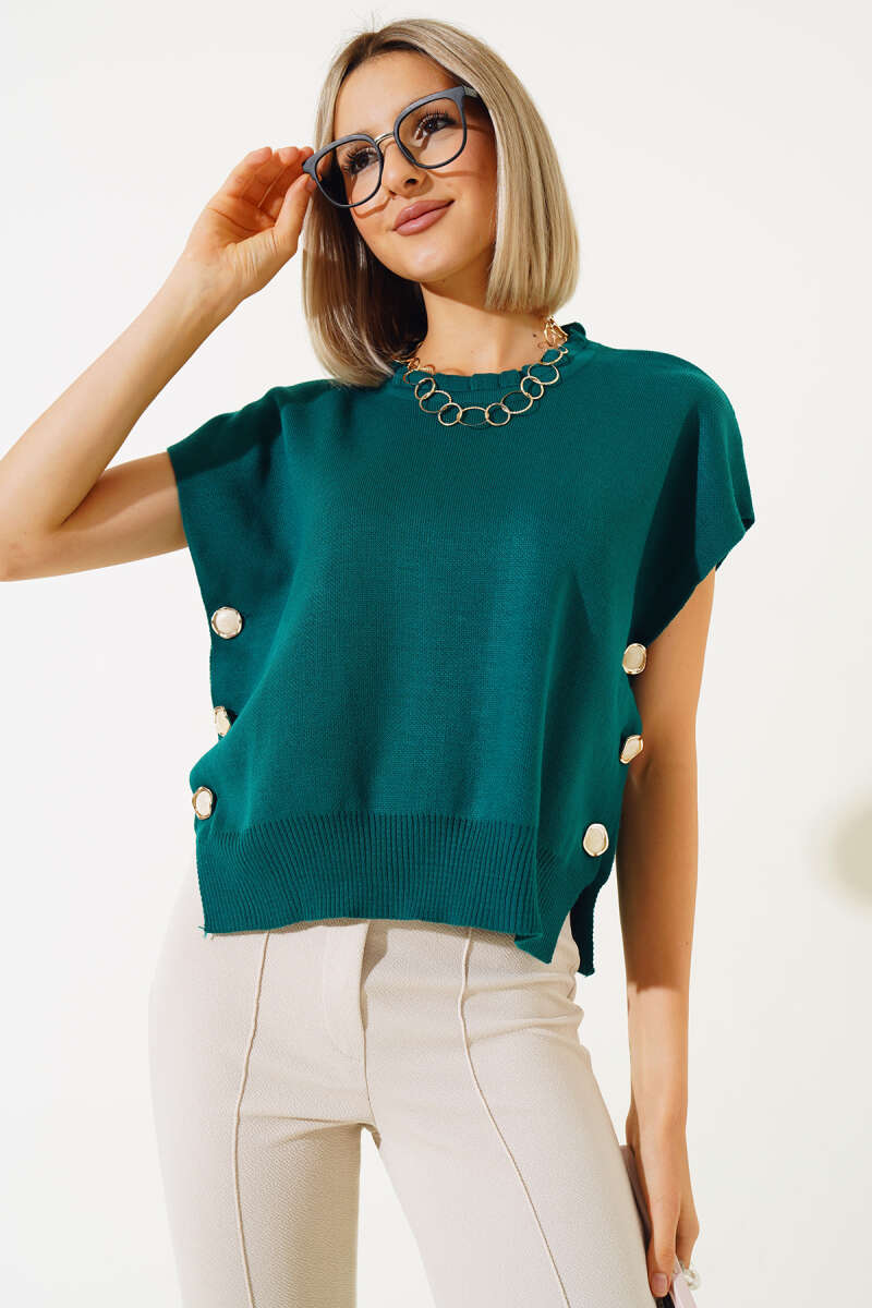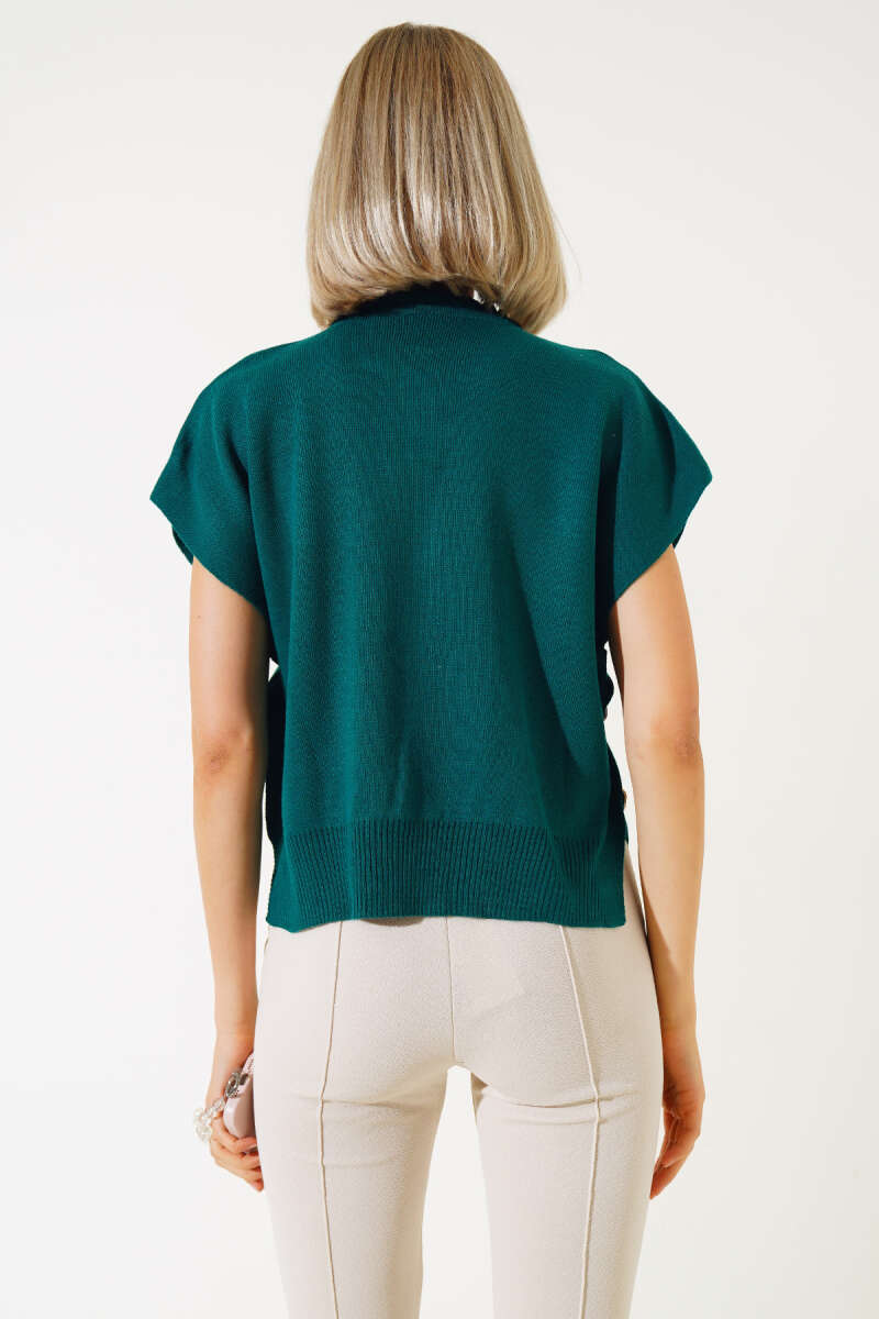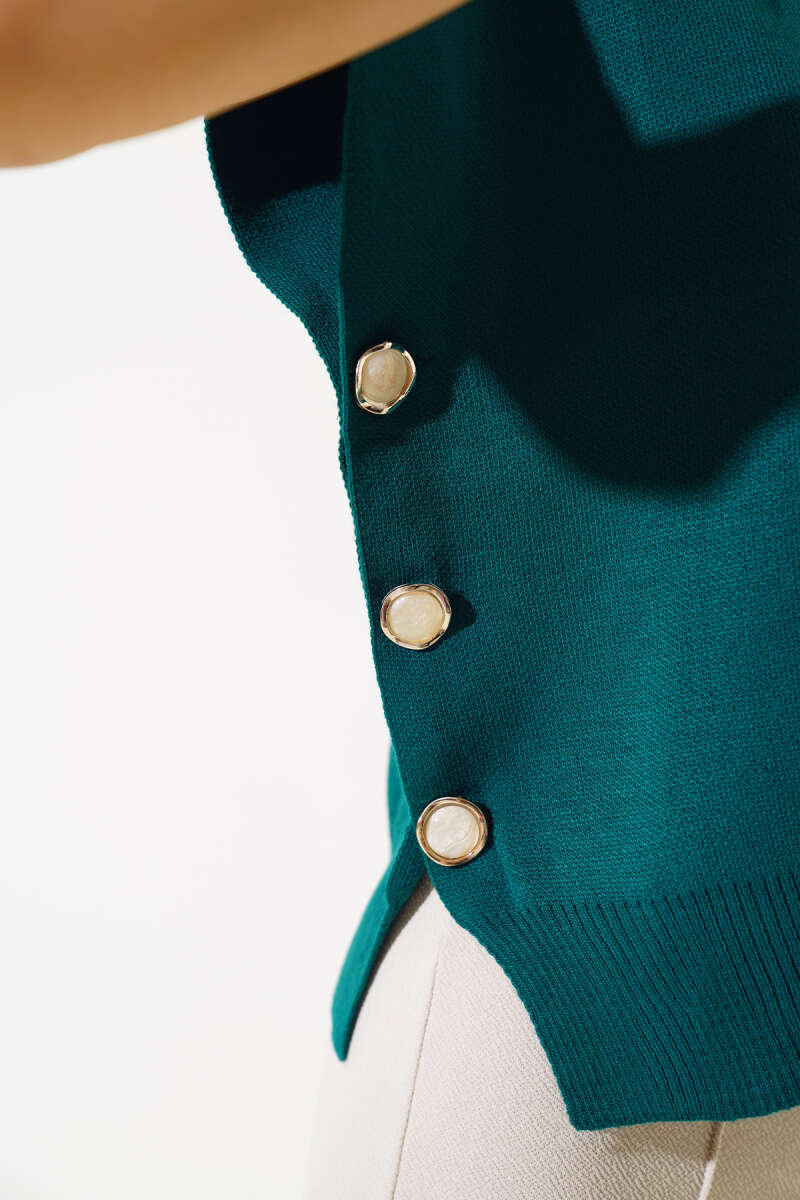 Yanları Düğmeli Yaka Fırfırlı Triko Süveter Zümrüt