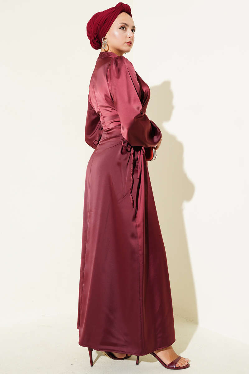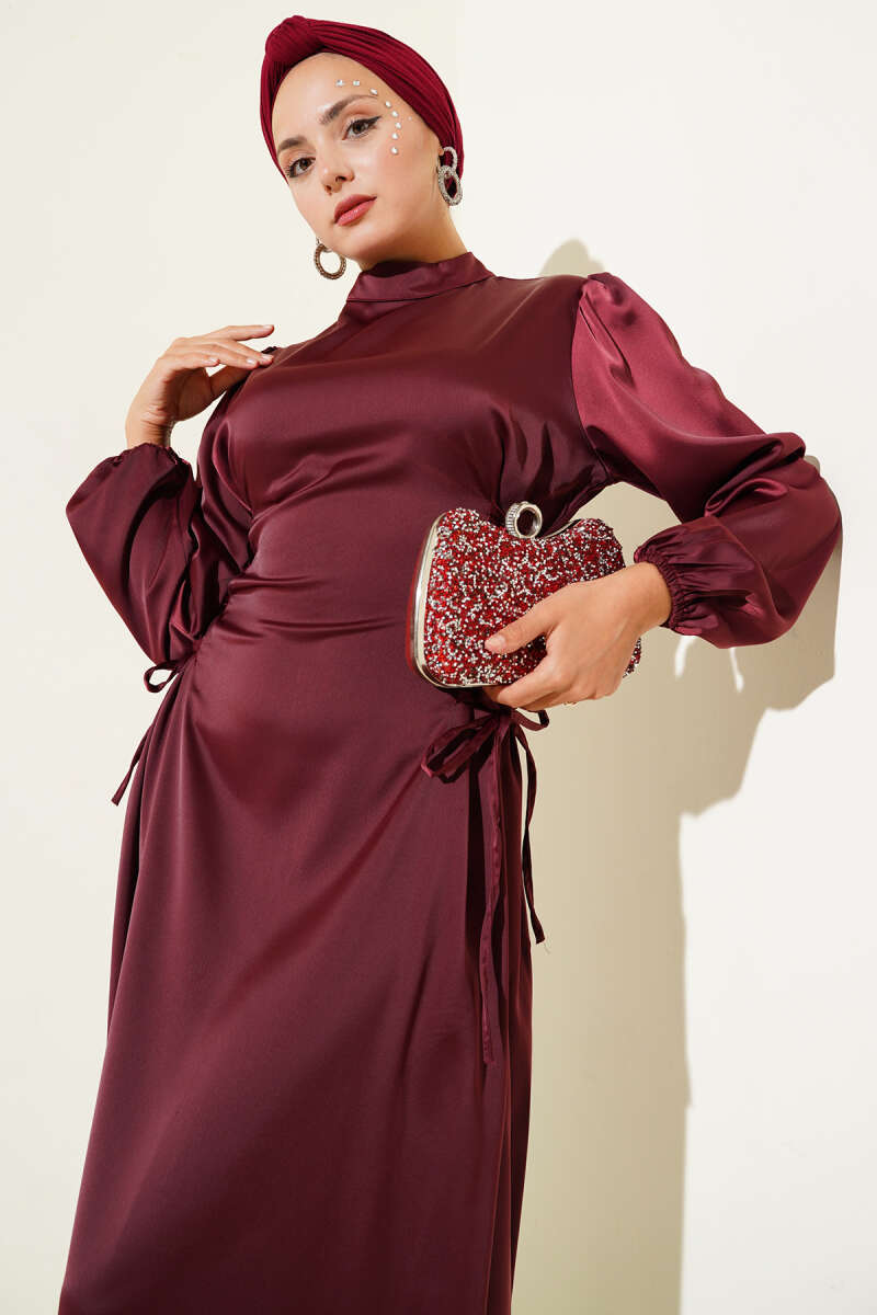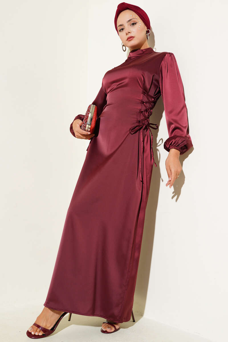 Yanları İp Bağcık Detaylı Saten Elbise Bordo