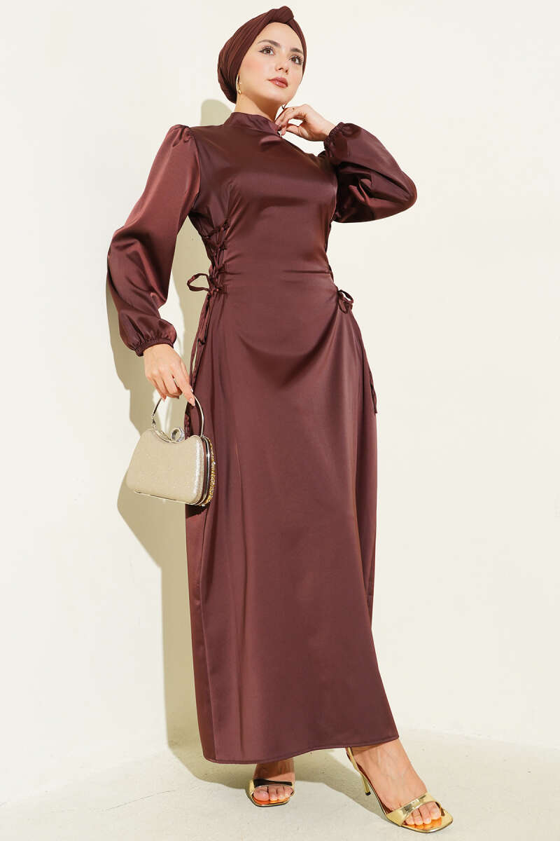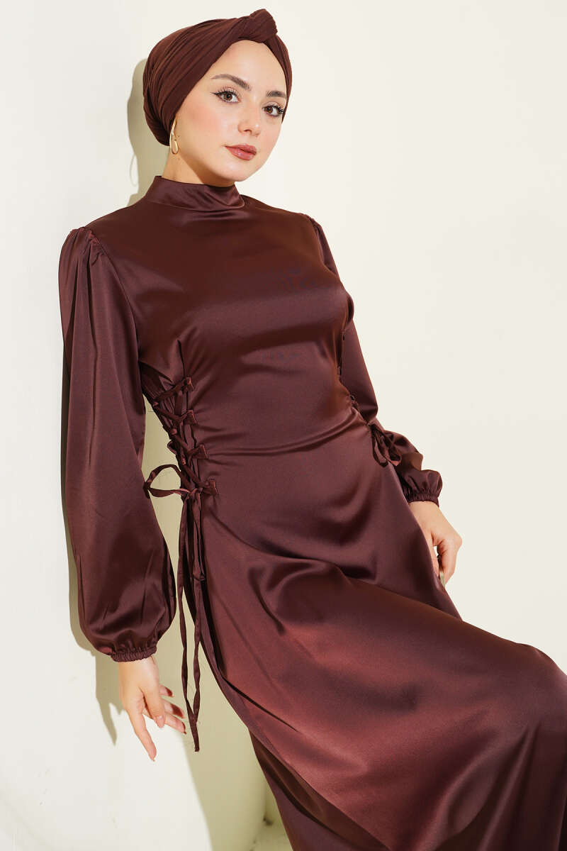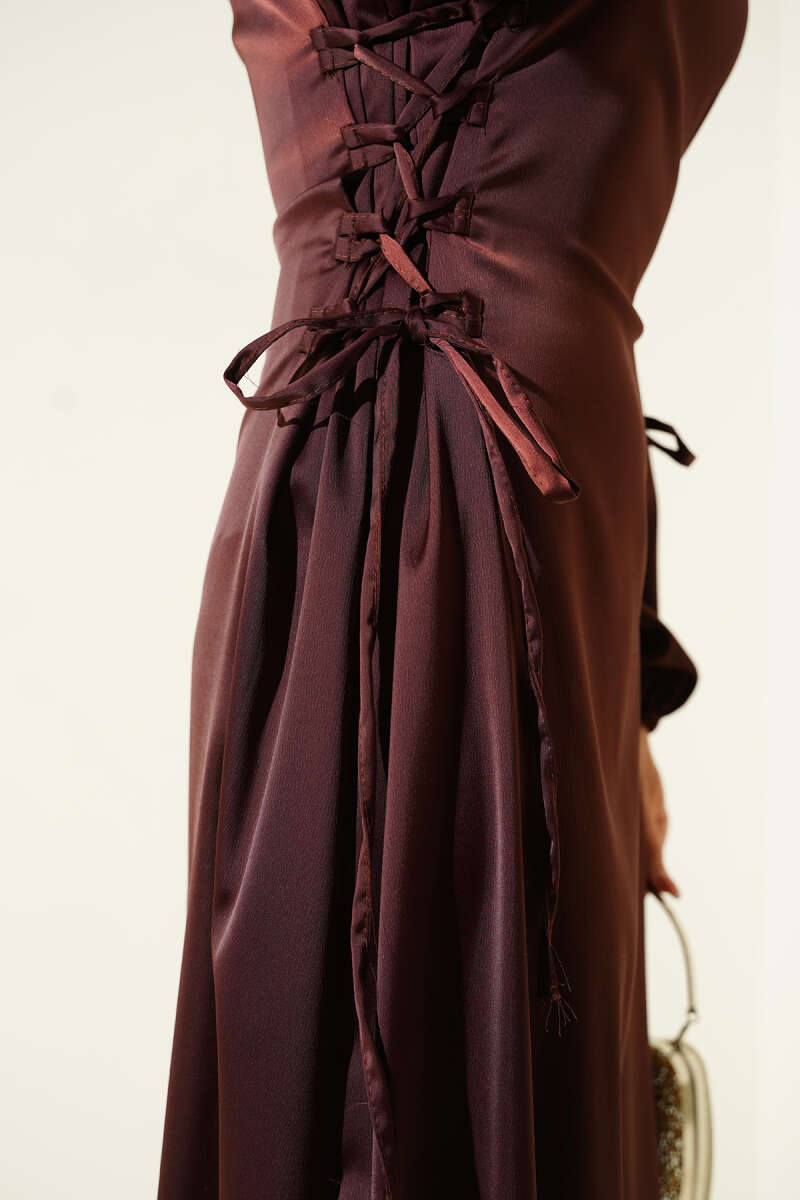 Yanları İp Bağcık Detaylı Saten Elbise Kahve