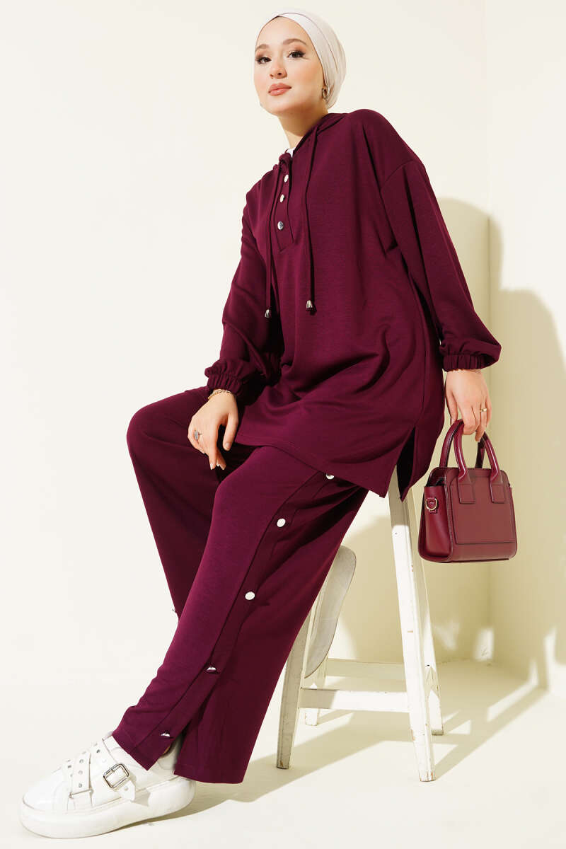 Yanları Metal Düğmeli Kapşonlu İkili Takım Füme
