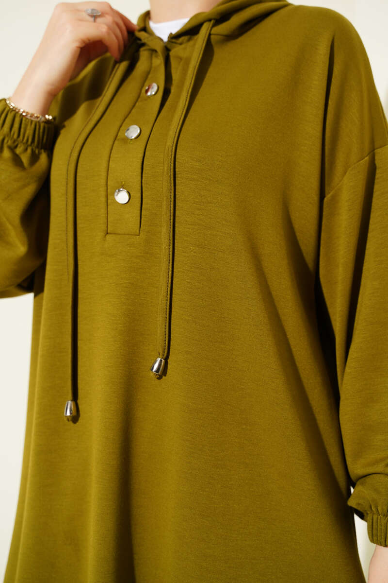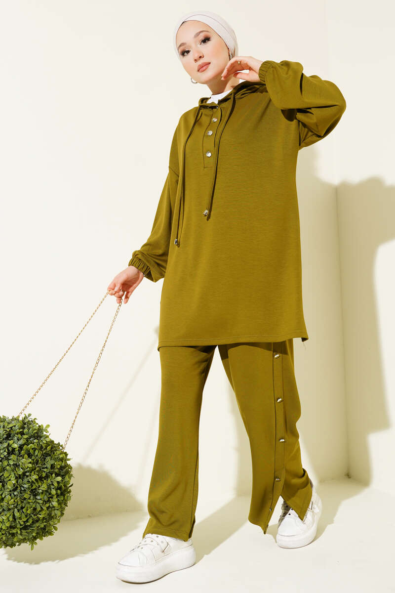Yanları Metal Düğmeli Kapşonlu İkili Takım Yağ Yeşili