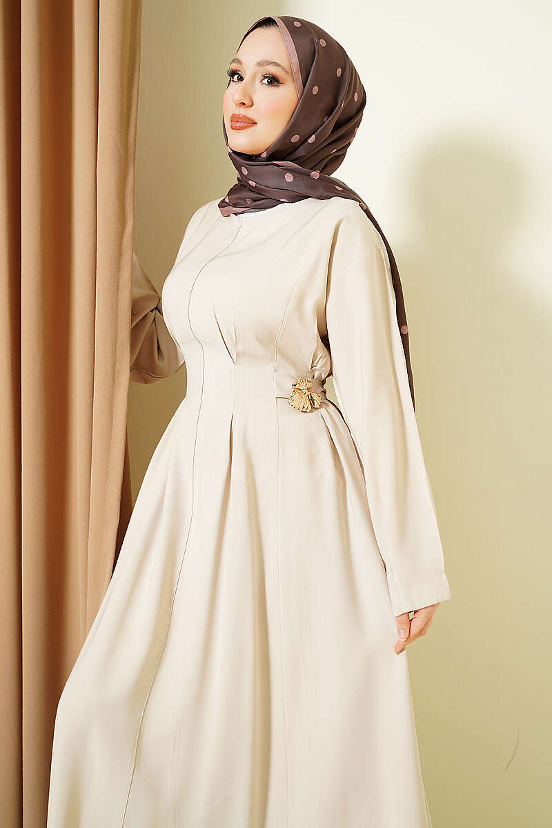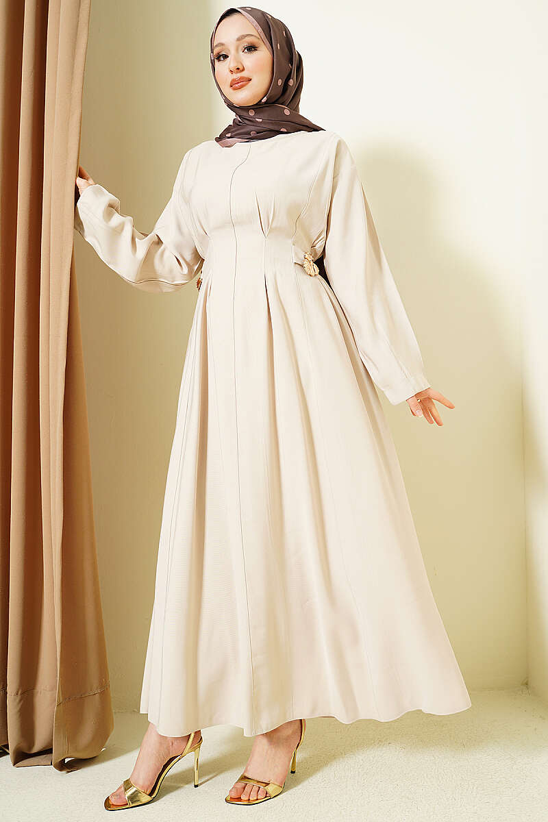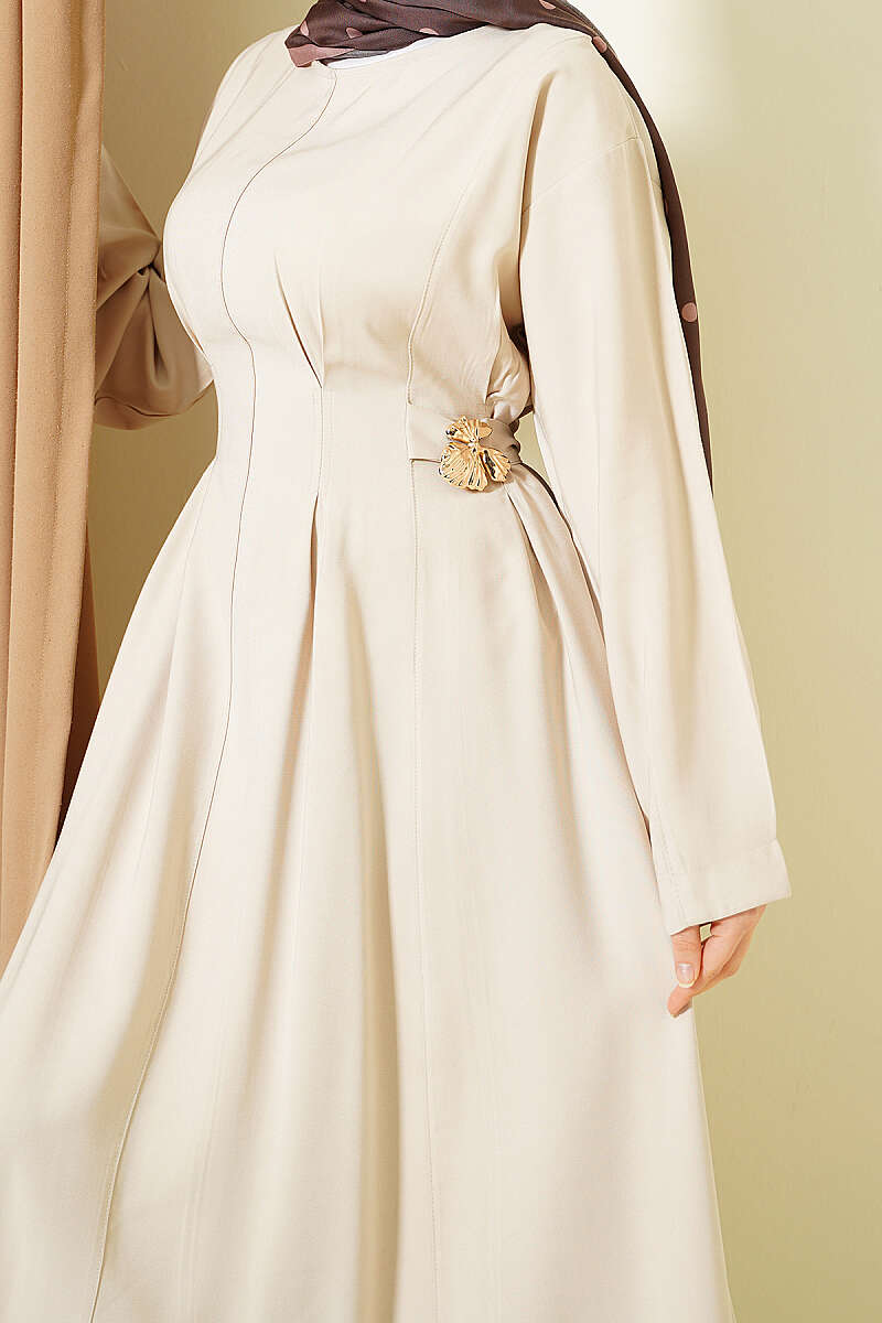 Yanları Tokalı Pensli Tensel Elbise Bej