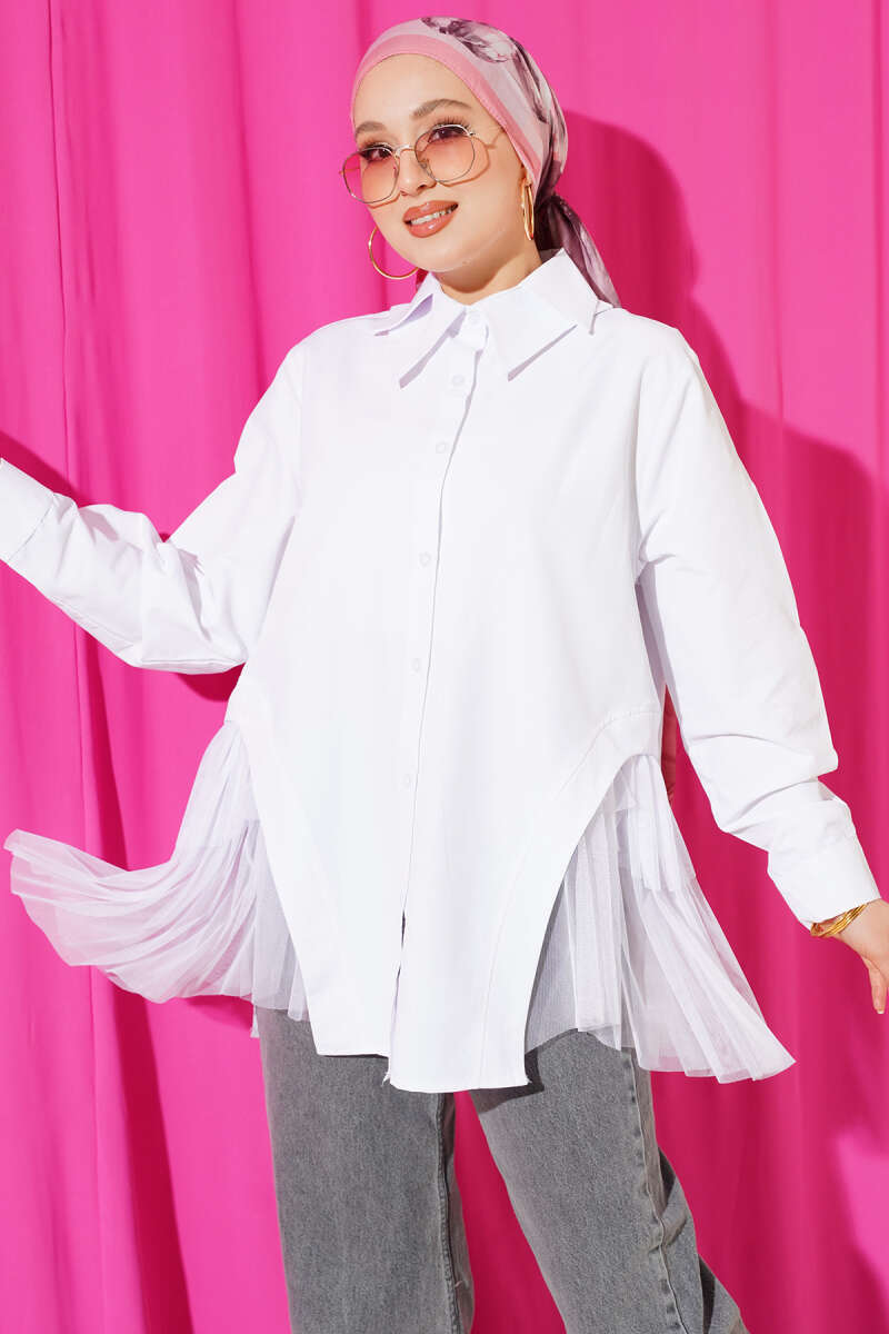 Yanları Tüllü Çift Yaka Gömlek Beyaz
