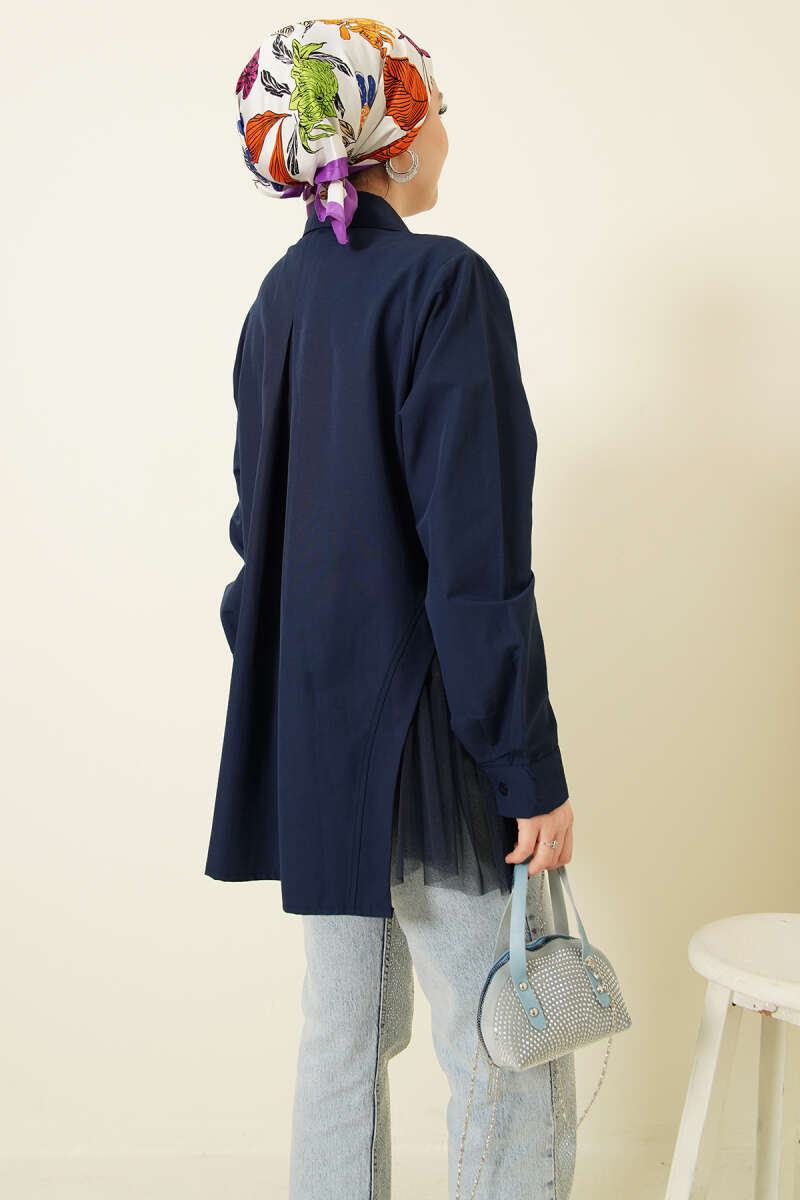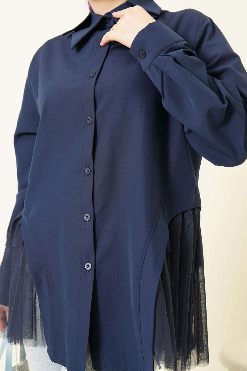 Yanları Tüllü Çift Yaka Gömlek Lacivert