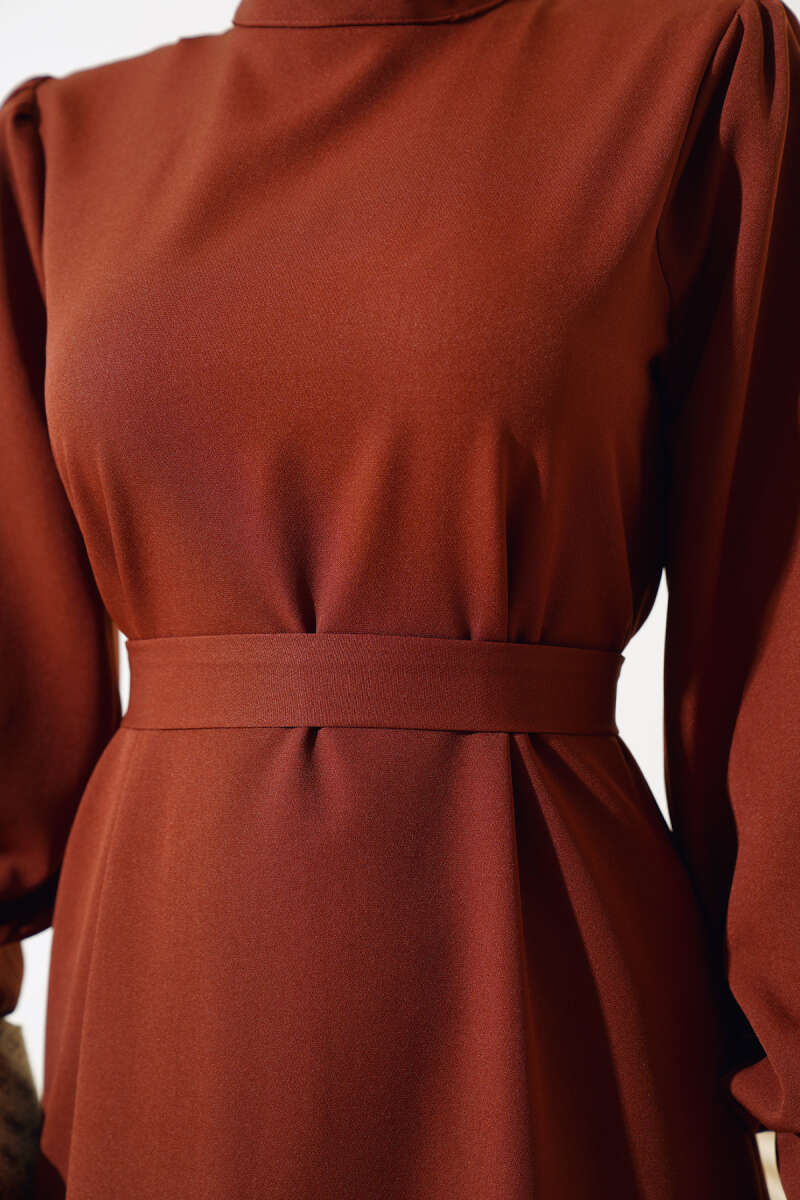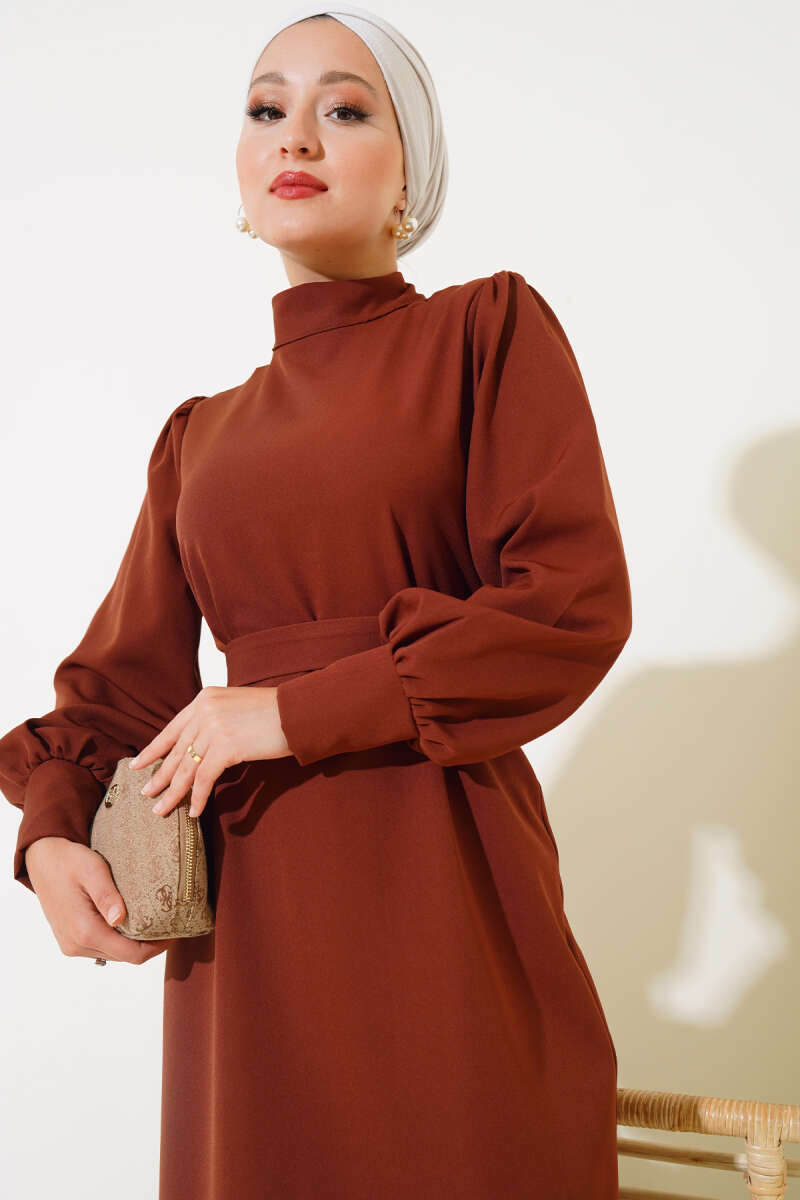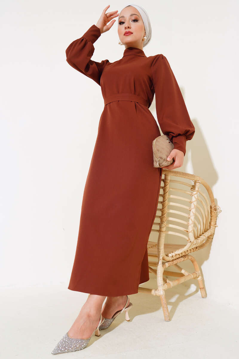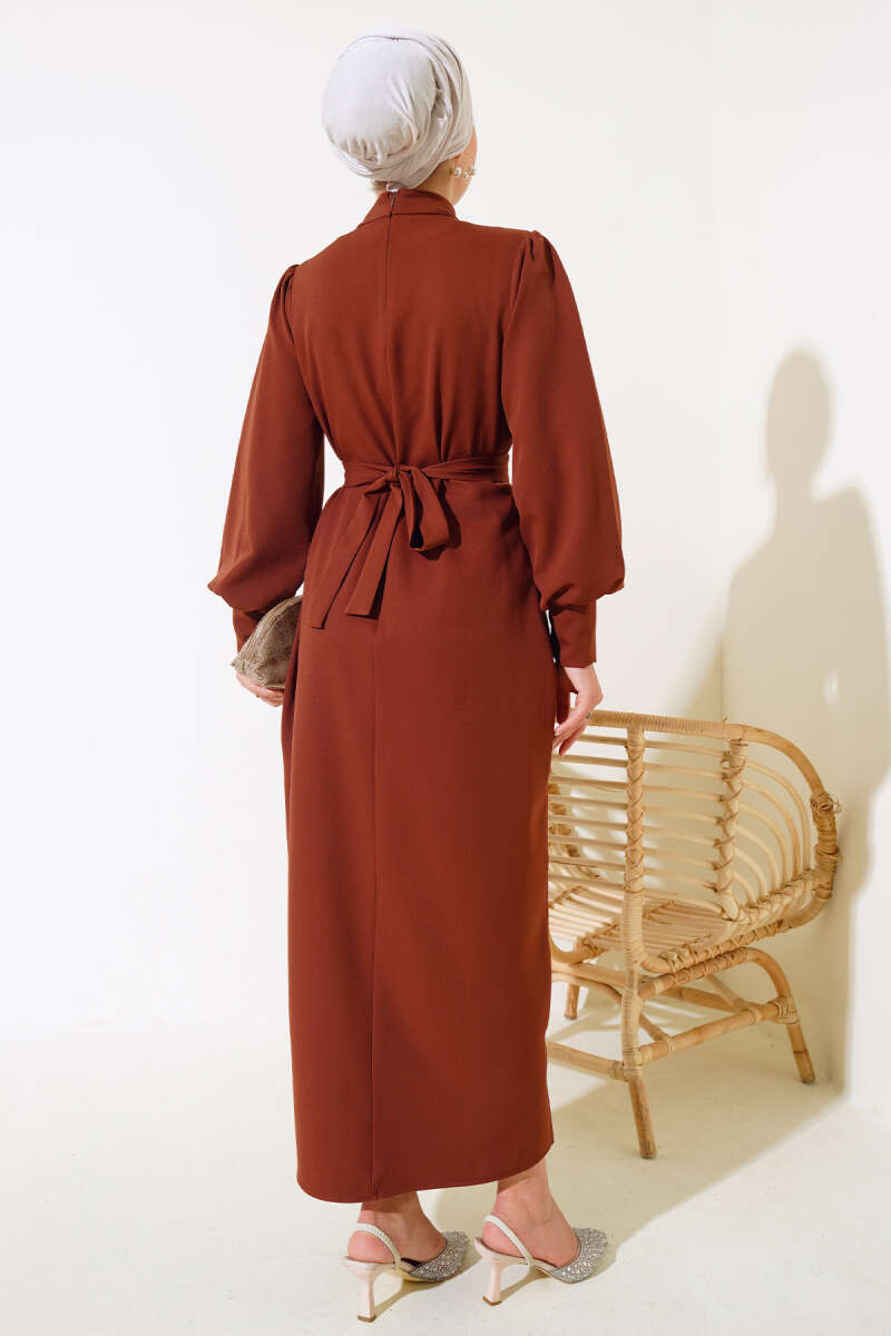 Bel Taşlı Pelerinli Abiye Elbise Kahve
