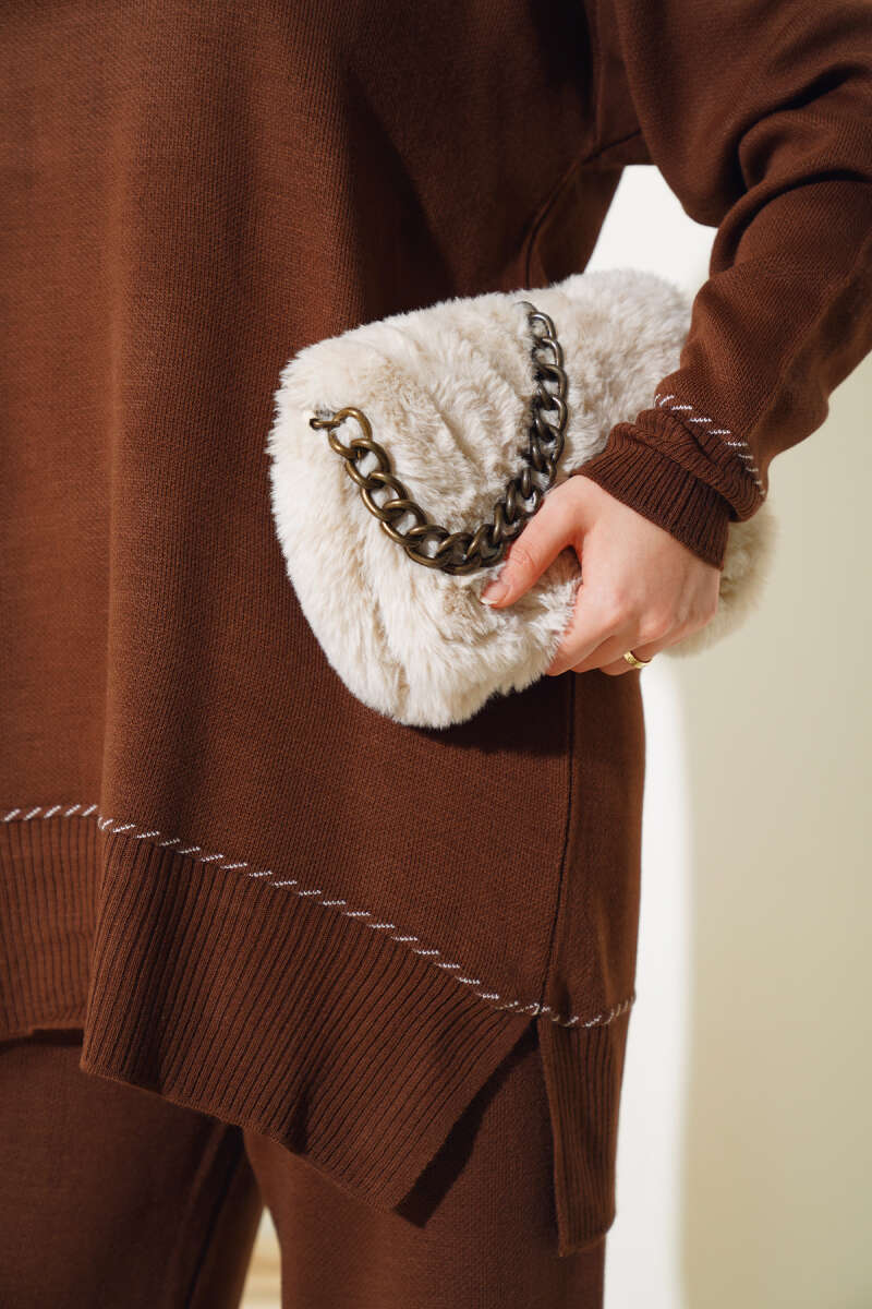 Balon Kol Balıkçı Yaka Triko İkili Takım Kahve