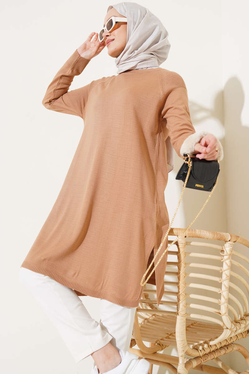 Gömlek Yaka Fularlı Triko Tunik Latte