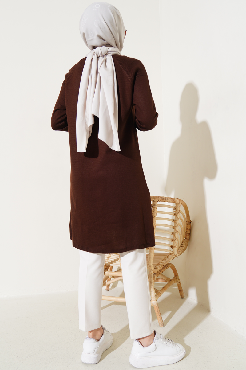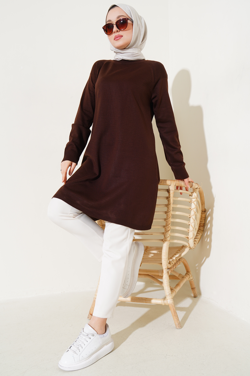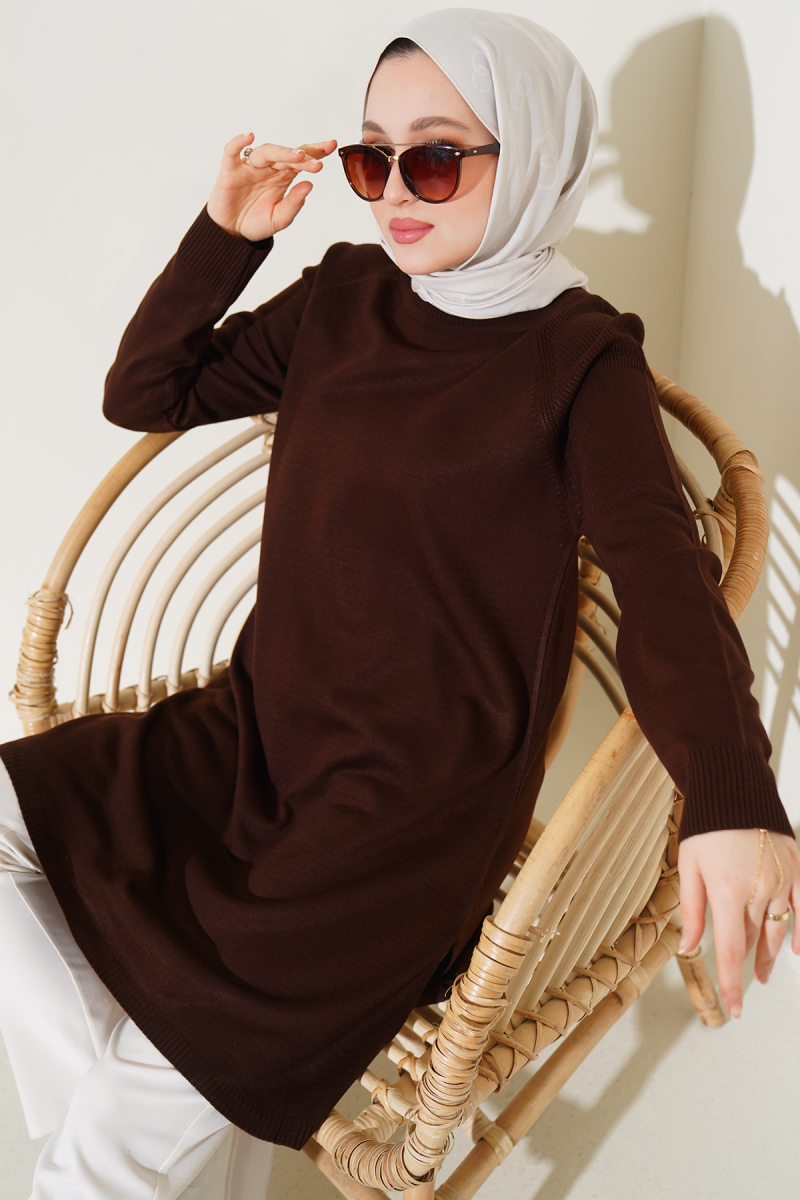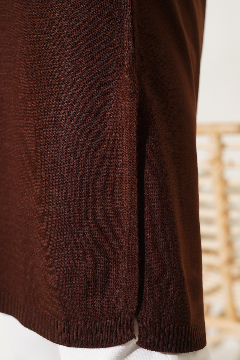 Yatay Çizgi Detaylı Basic Triko Tunik Kahve