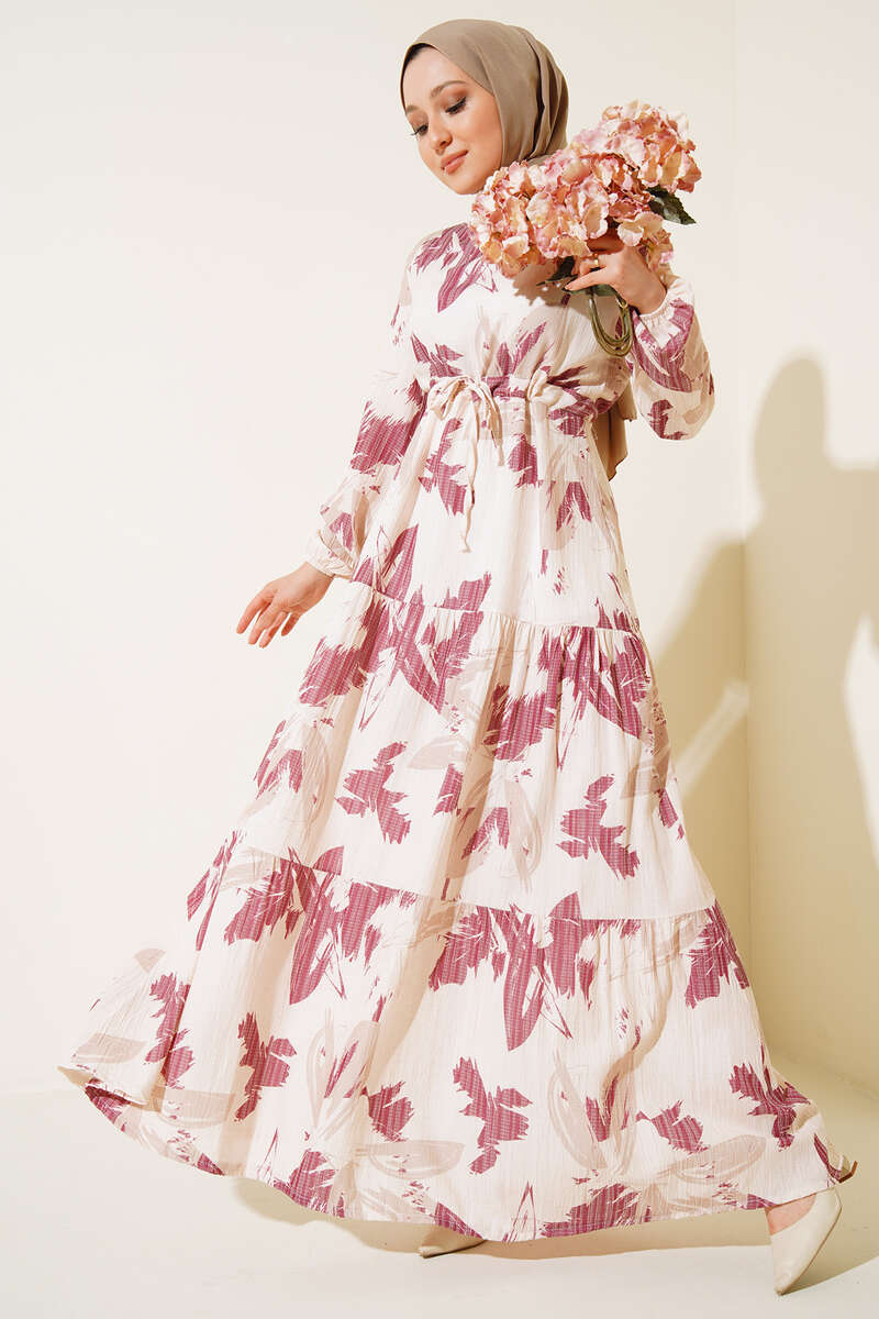 Yeni sezon elbisemiz renkli yaprak desenleriyle bu yazın en dikkat çekecek modellerindendir. Bilekleri lastikli olan elbisemizin ense düğmesi vardır. Beli tünelli ip bağlaması detayıyla hareket kazanmıştır.