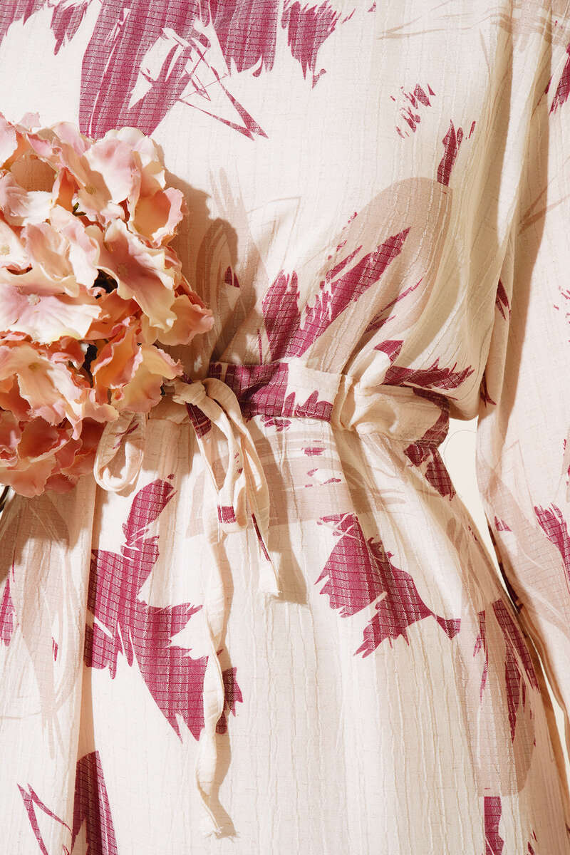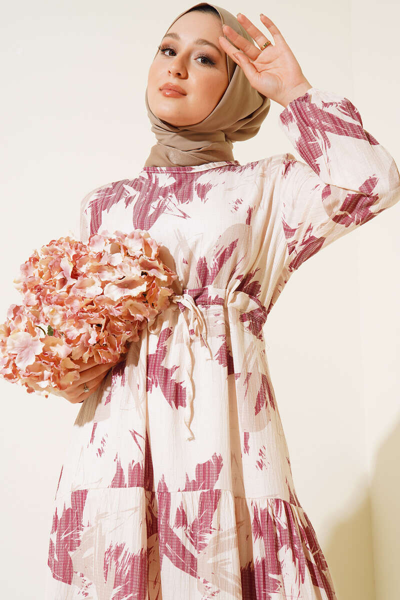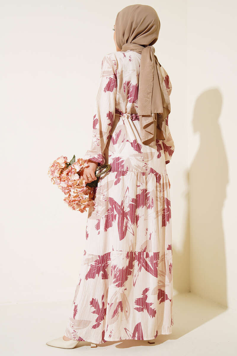 Yaprak Desen Kat Kat Bel Bağcıklı Elbise Bordo