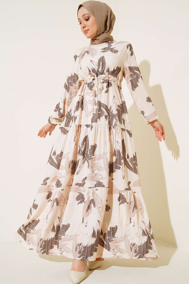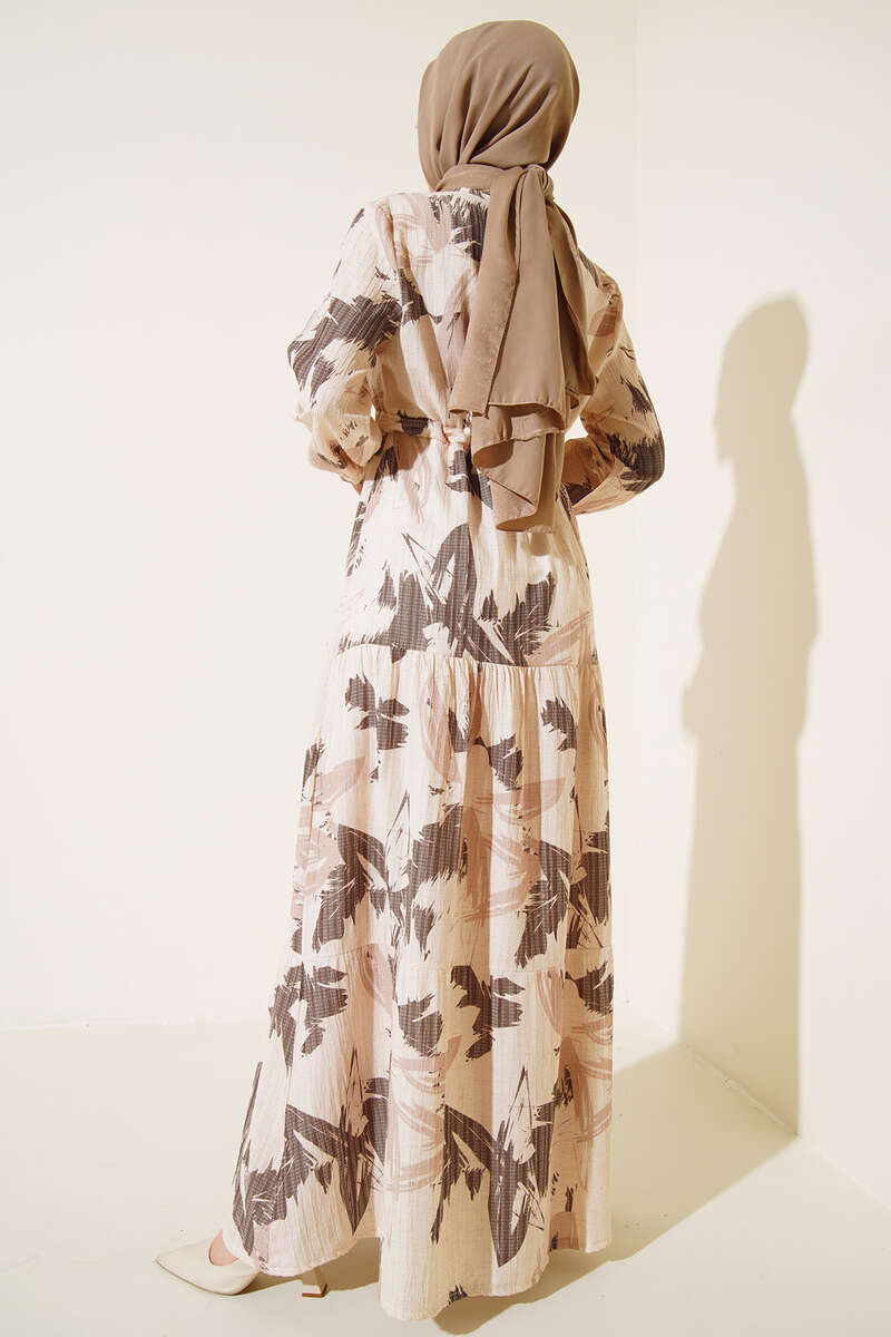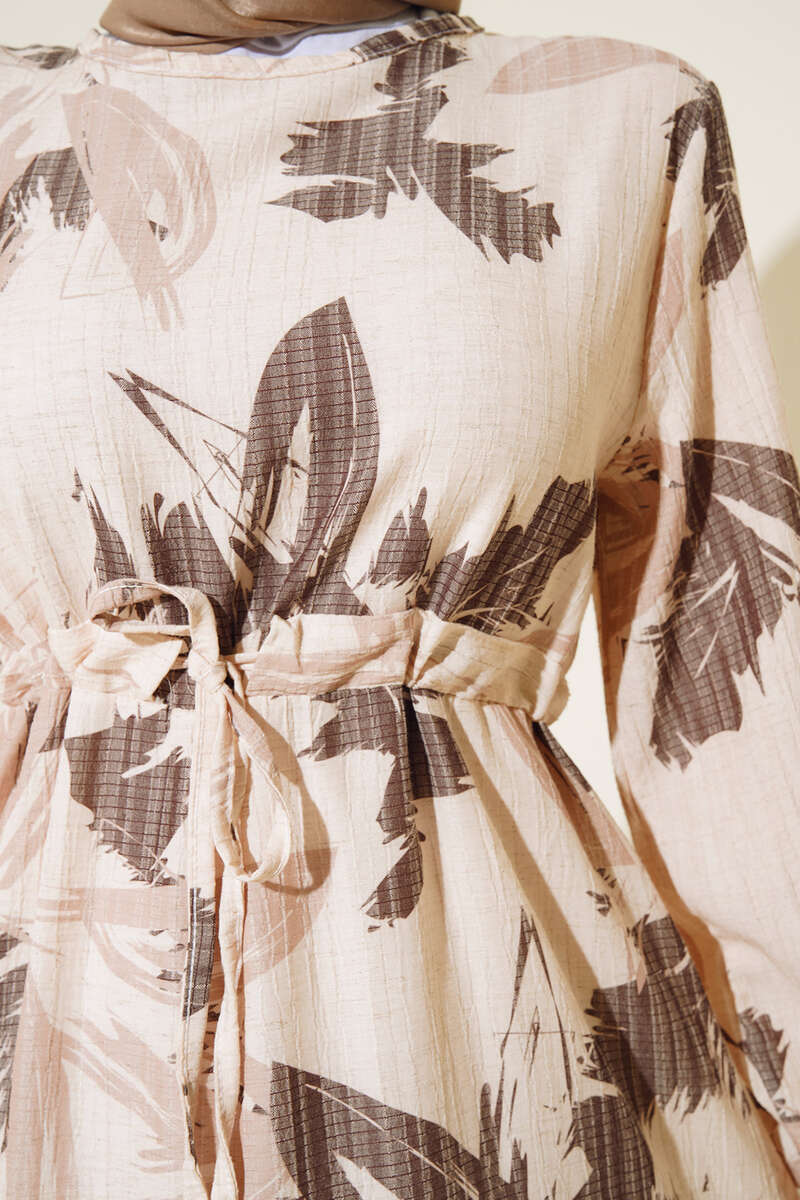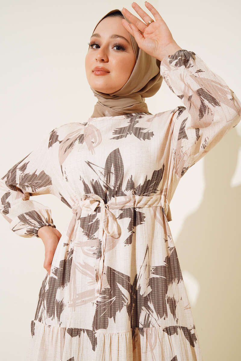 Yaprak Desen Kat Kat Bel Bağcıklı Elbise Kahve