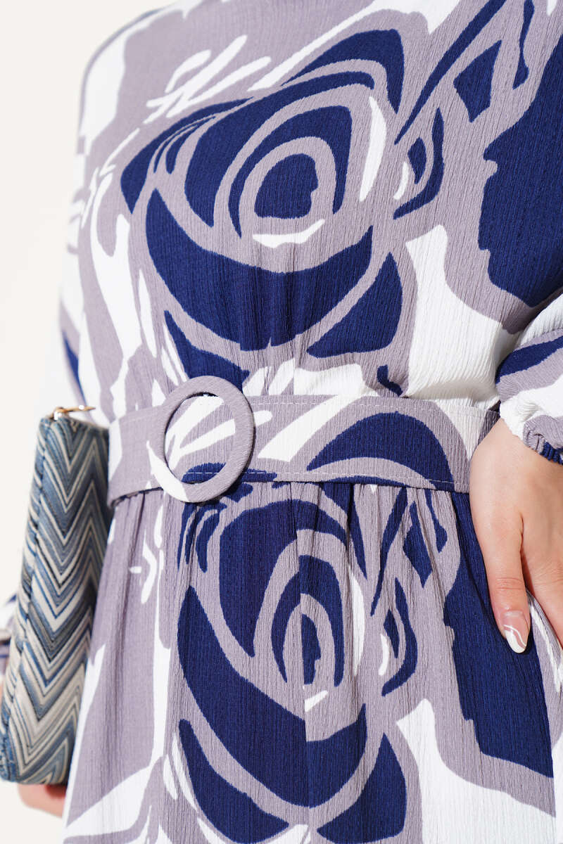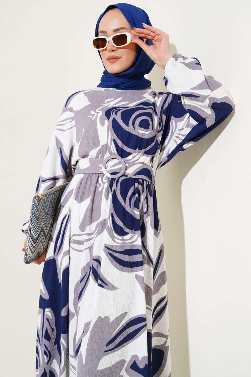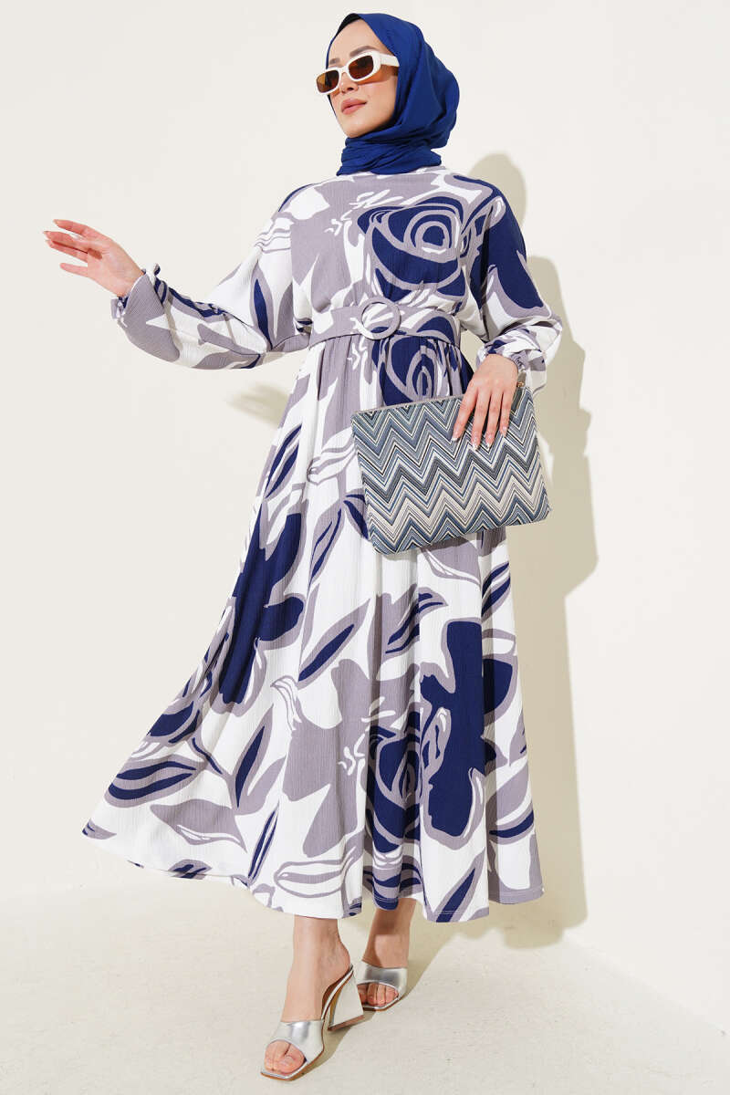 Yaprak Desenli Bel Lastikli Kemerli Elbise Lacivert