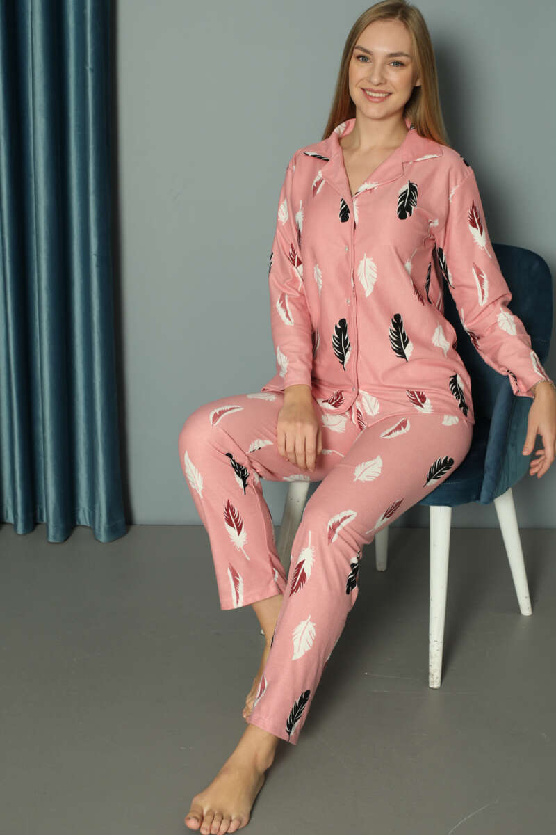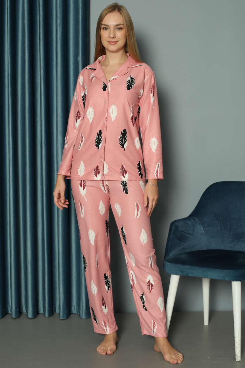 Yaprak Desenli Gömlek Yaka Süet Pijama Takım Pembe