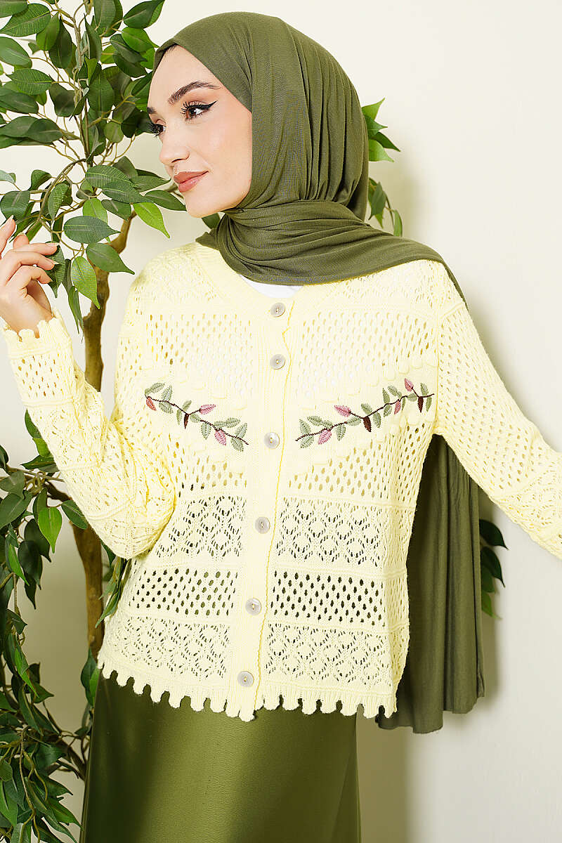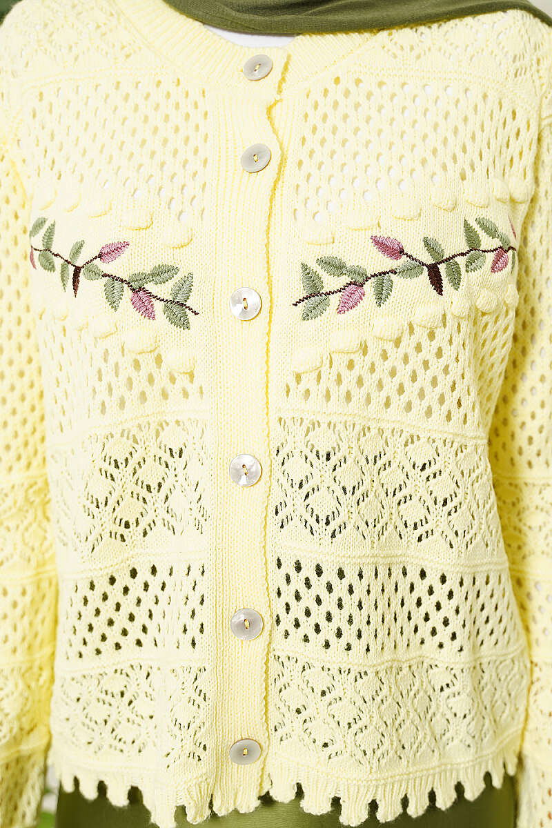 Yaprak Nakışlı Ajurlu Kısa Triko Hırka Sarı