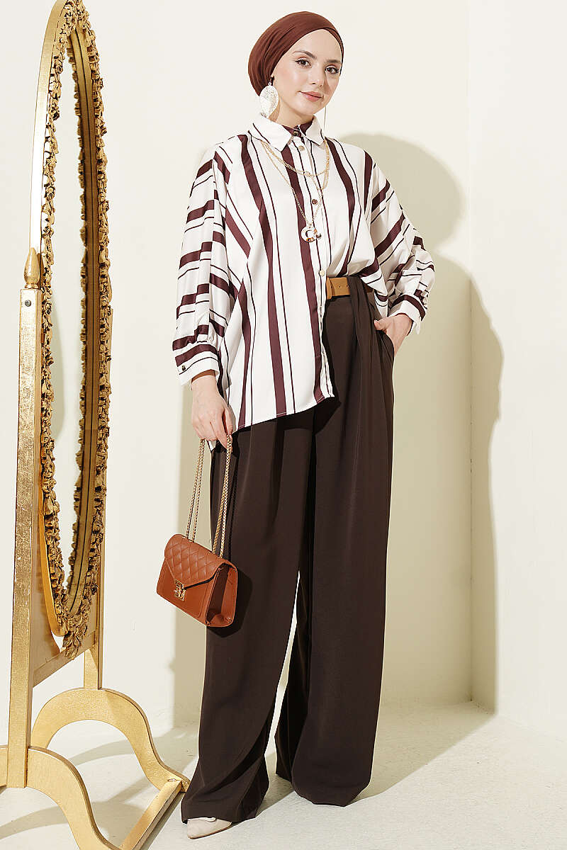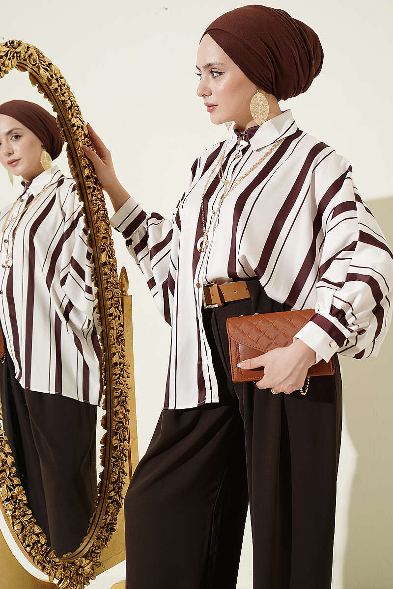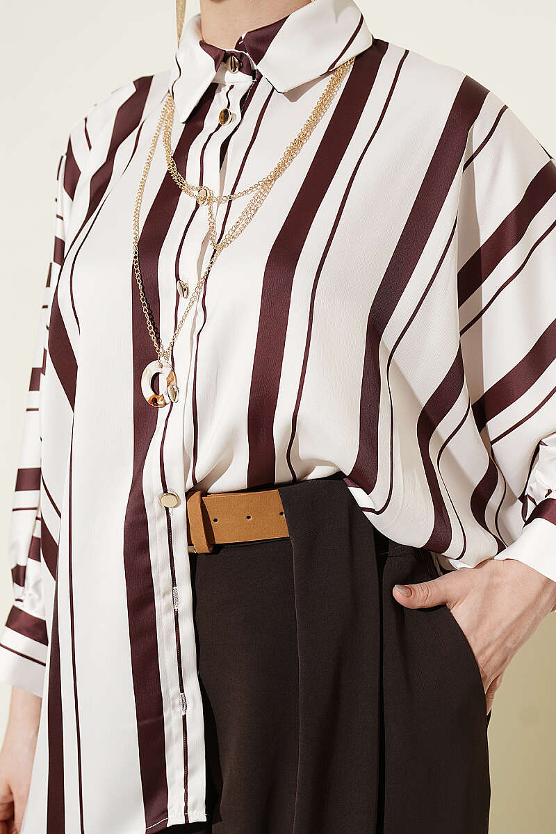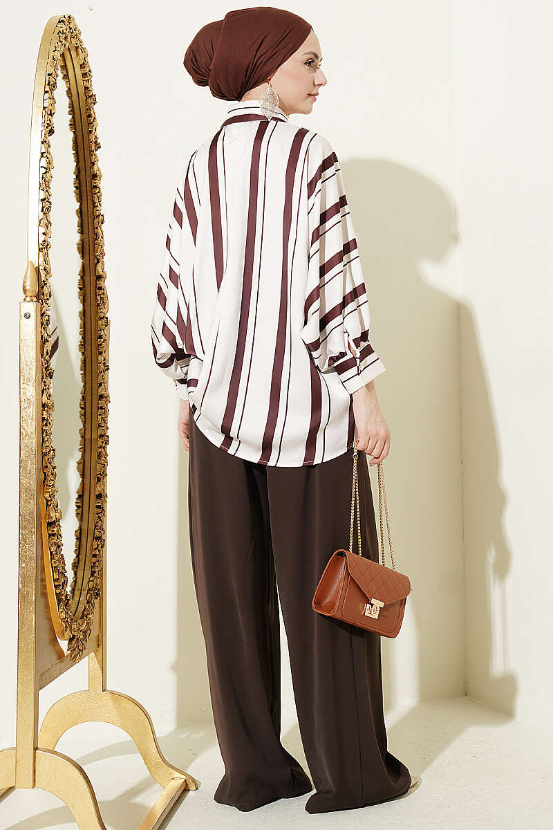 Yarasa Kol Asimetrik Çizgili Saten Gömlek Kahve