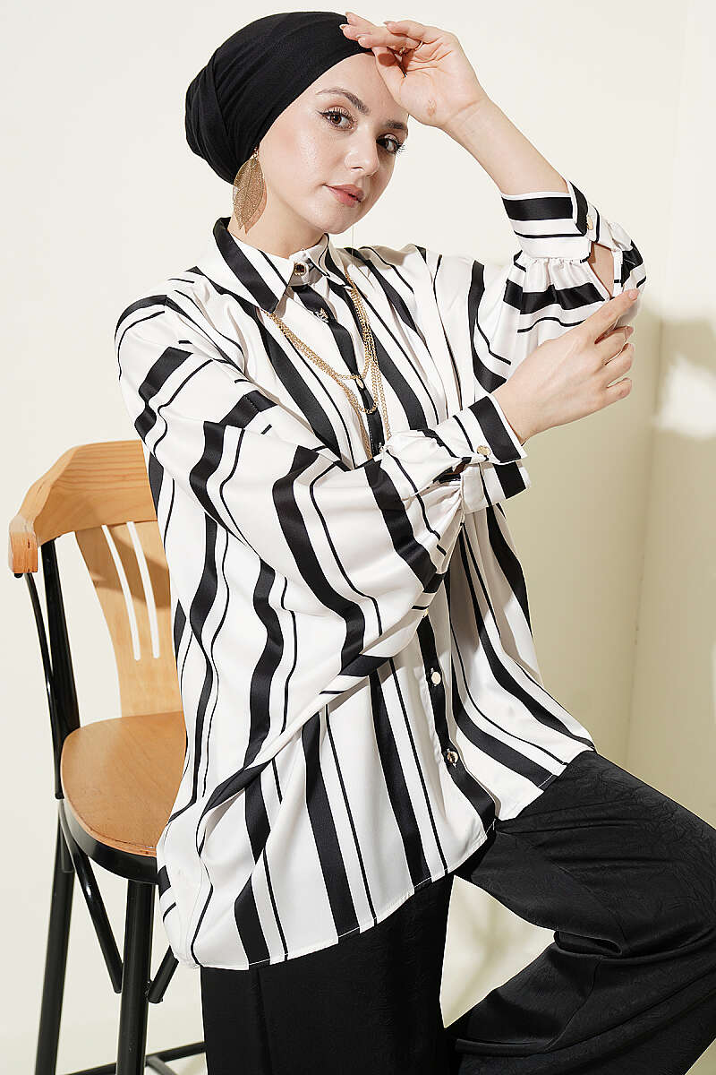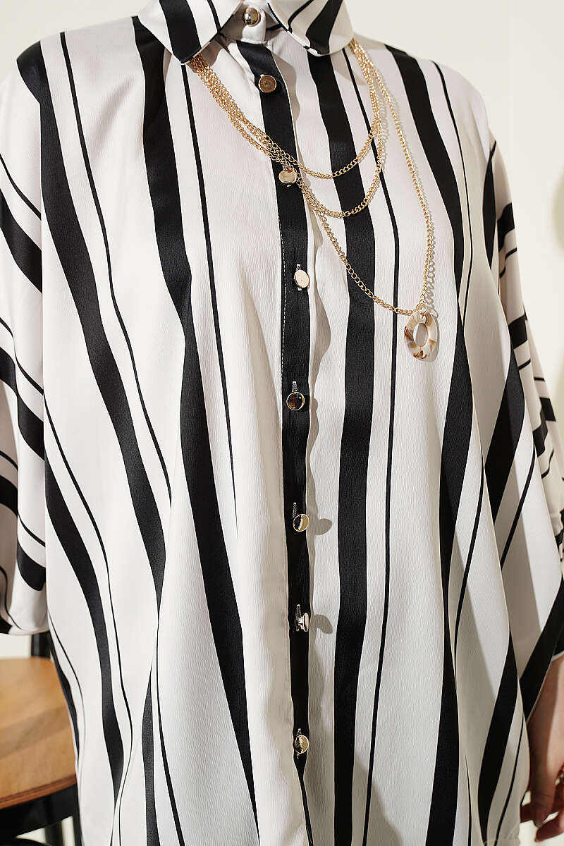 Bu gömlek, saten dokusunun verdiği zarif parlaklığı dikey çizgili deseniyle birleştirerek modern ve sofistike bir görünüm sunar. Geniş kesim yarasa kolları ve asimetrik alt formu, tasarıma hem hareket hem de konforlu bir şıklık katar. Klasik yaka ve düğme detaylarıyla tamamlanan bu parça, kumaş pantolonlar veya eteklerle kombinlendiğinde ofis stilinden özel davetlere kadar geniş bir kullanım alanı sağlar.