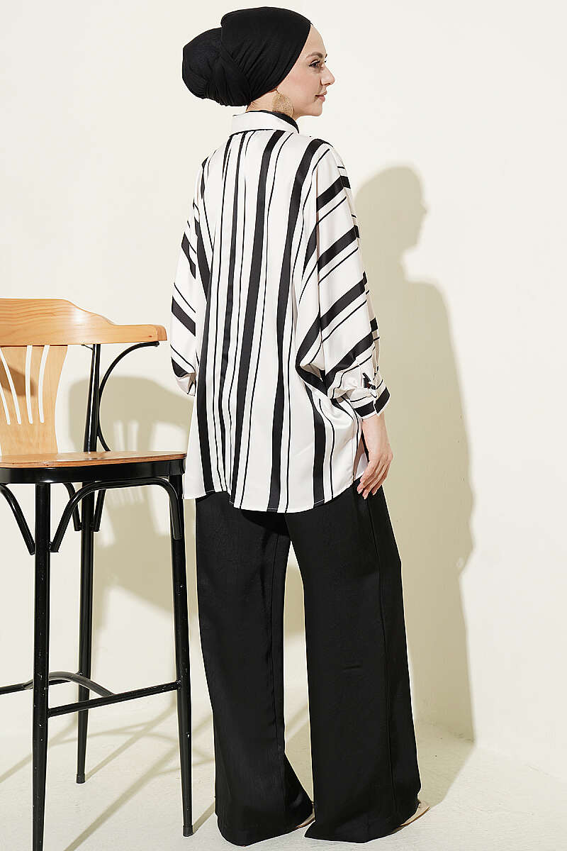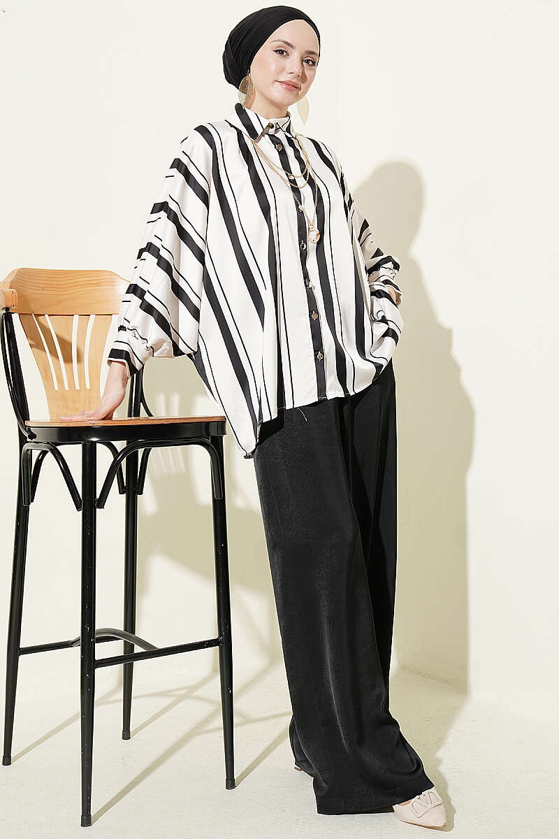 Yarasa Kol Asimetrik Çizgili Saten Gömlek Siyah