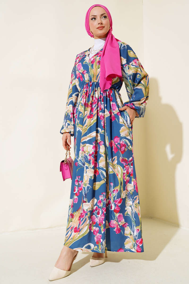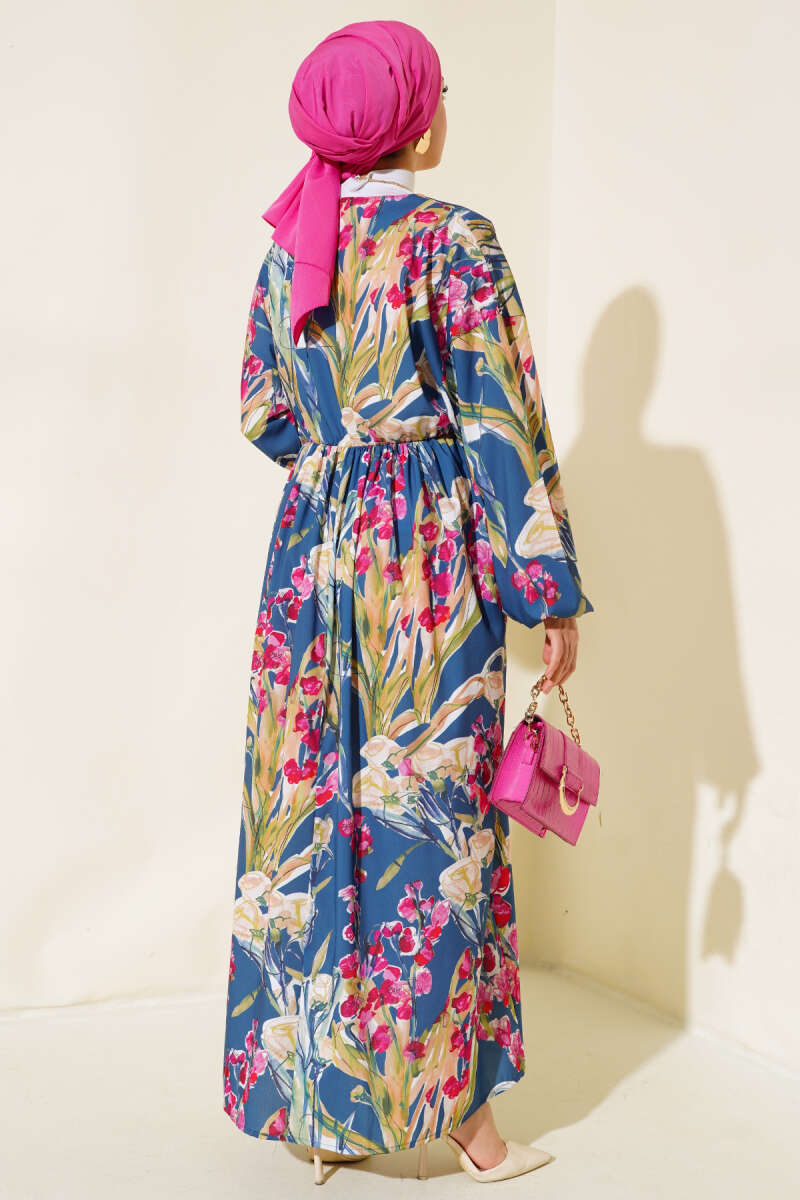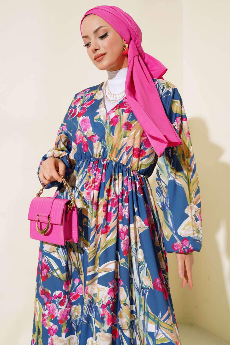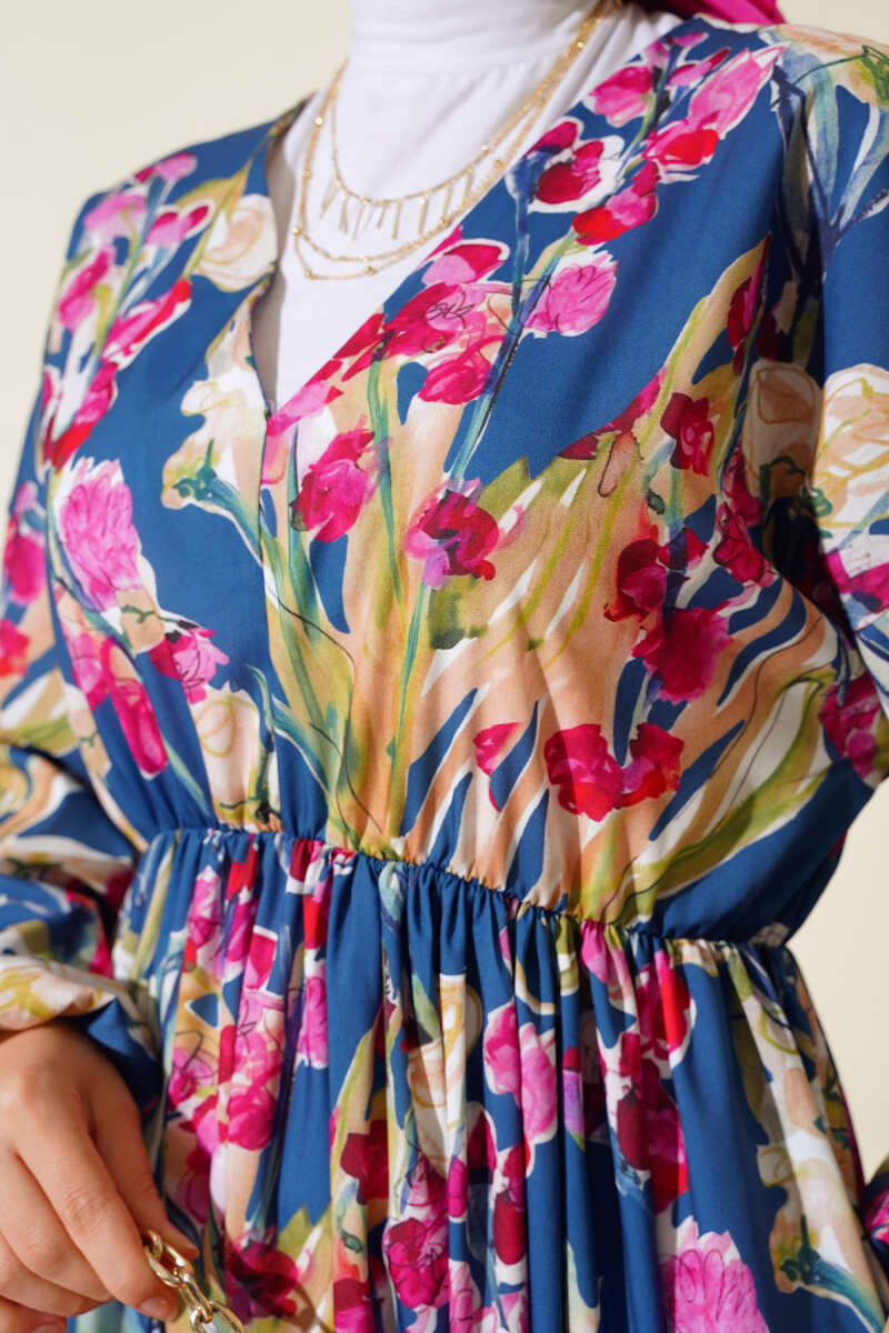 Yarasa Kol Çiçek Desenli Elbise İndigo