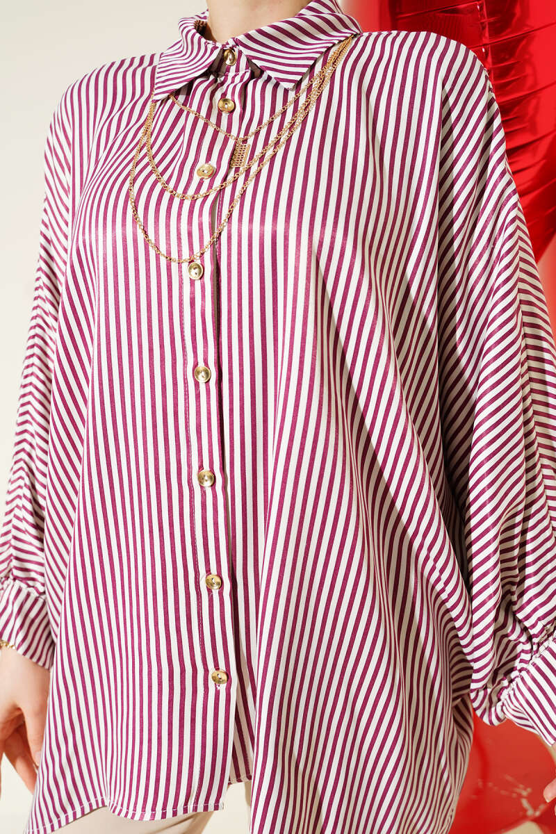 Yarasa Kol Çizgili Oversize Gömlek Bordo