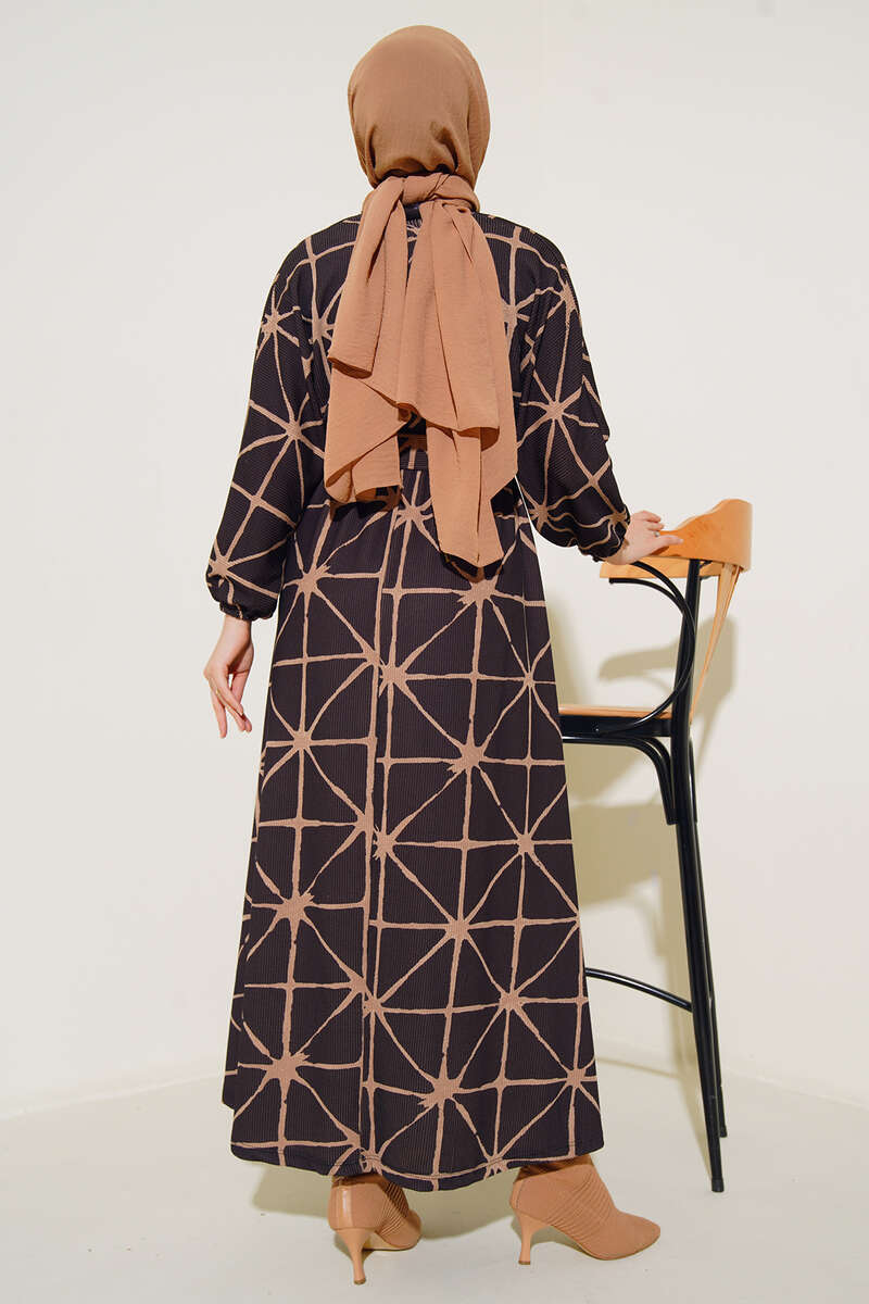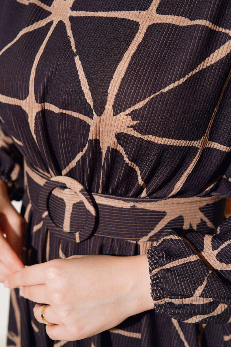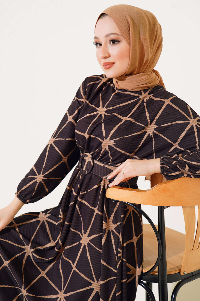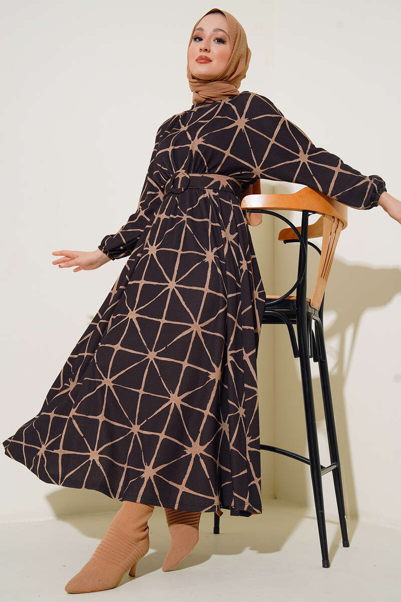 Yeni sezon elbisemiz desenli modeldir. Elbisemizin yakası bisiklet yakadır. Yarasa kola sahip olan elbisemizin bel kısmı lastiklidir. Kendi kumaşından tokalı kemeri bulunmaktadır. Bilek kısımları lastiklidir. Elbisemizin eteği kloş kesimdir.
