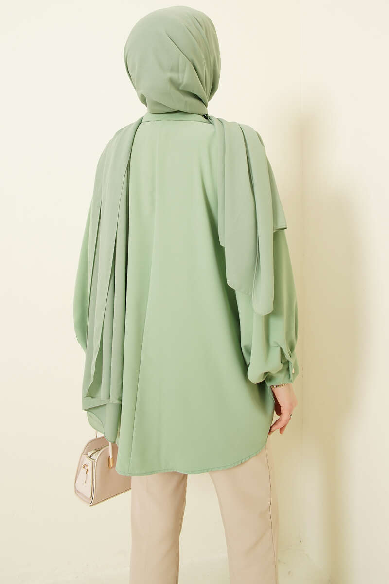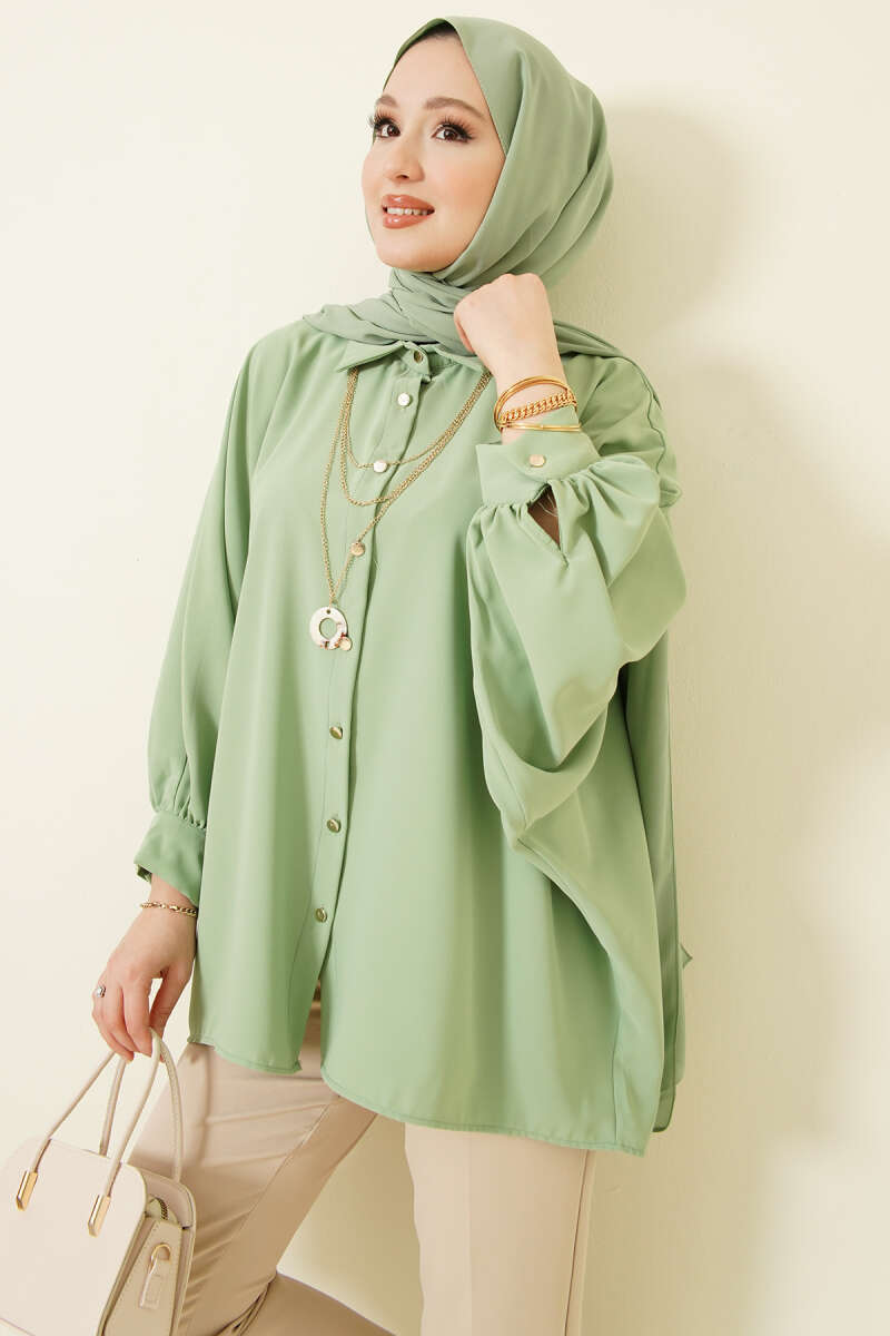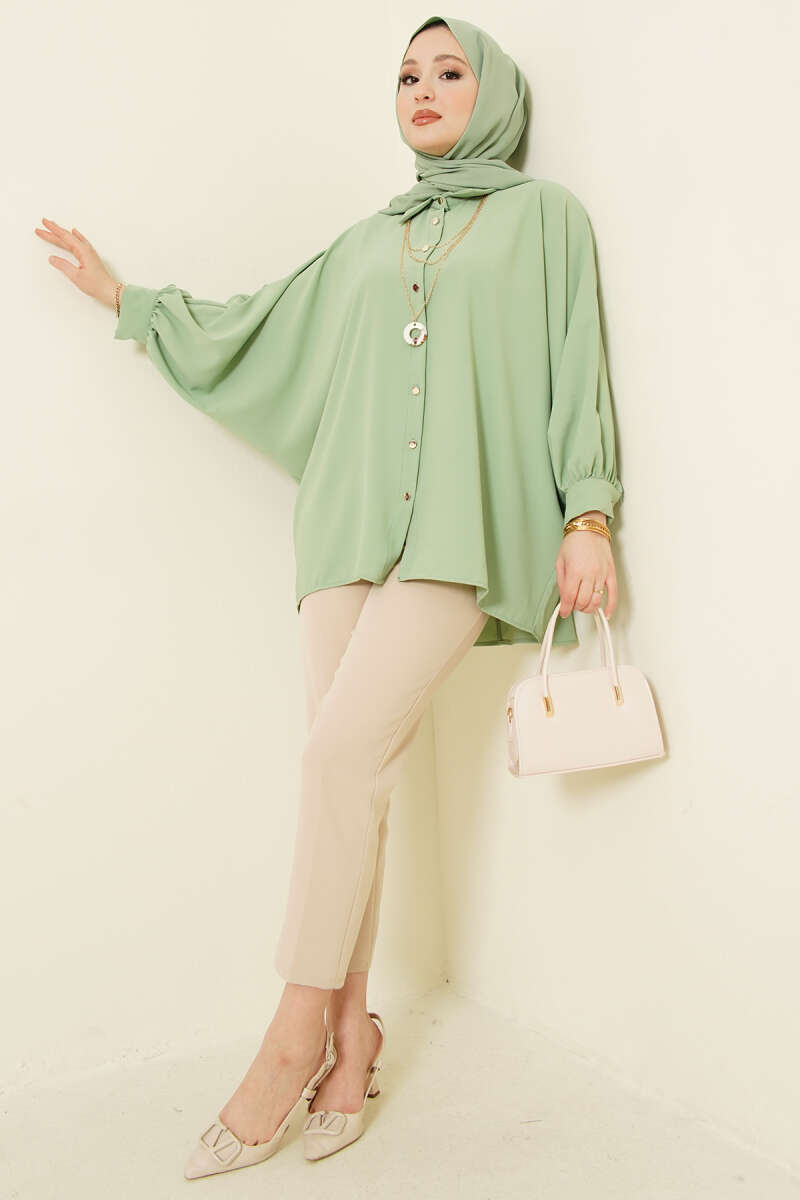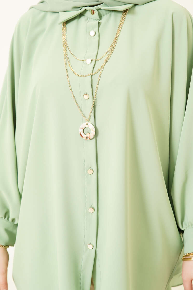 Yarasa Kol Kolyeli Oversize Gömlek Fıstık Yeşili
