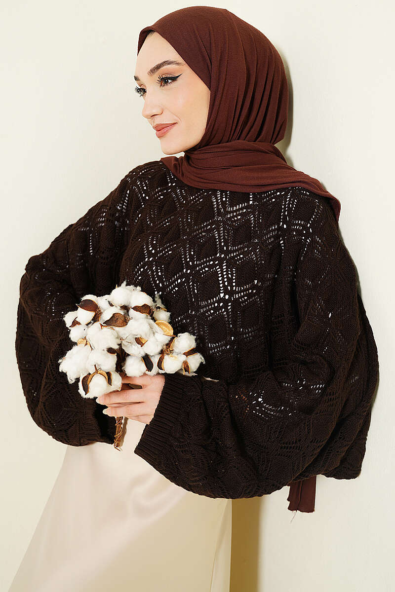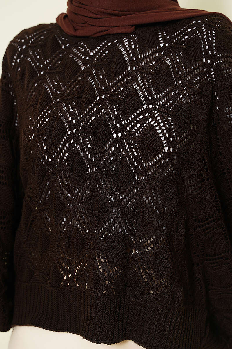 Delikli Yarasa Kol Triko Ajur Kazak Kahve
