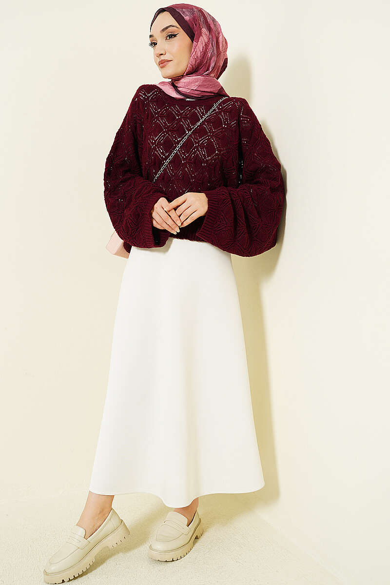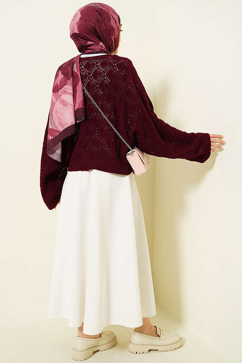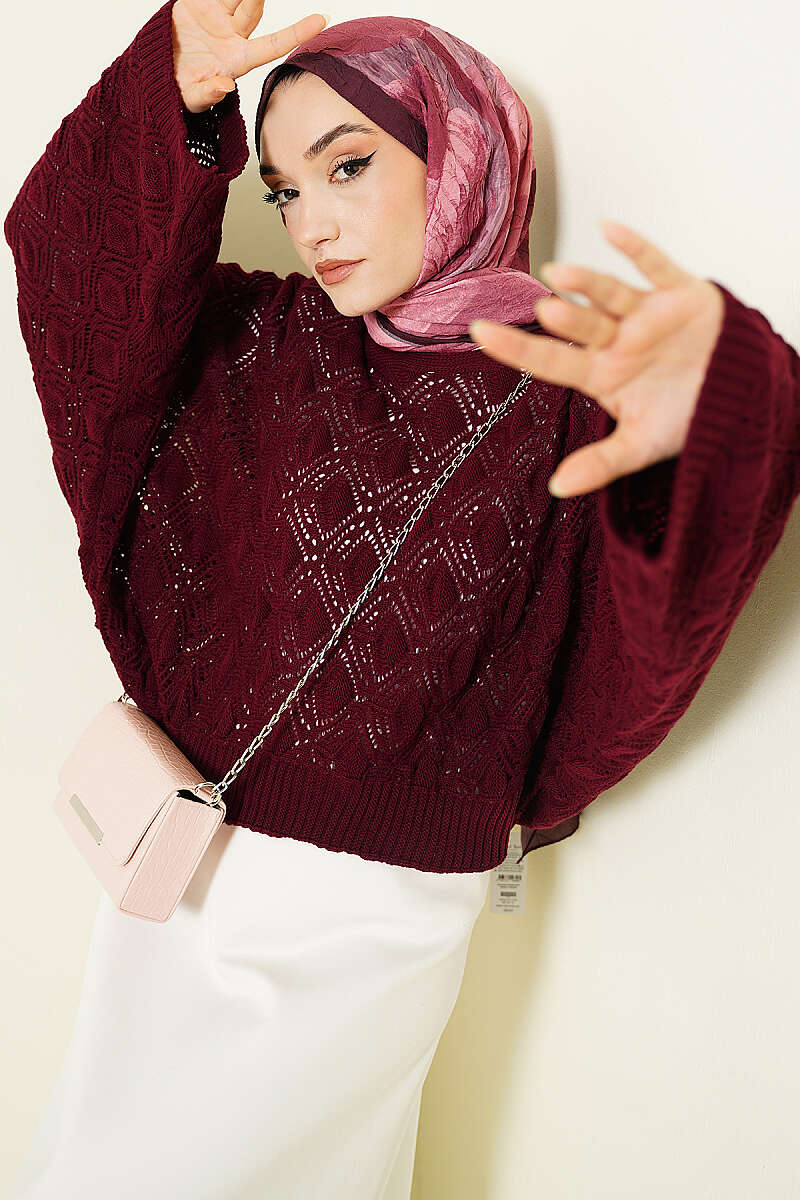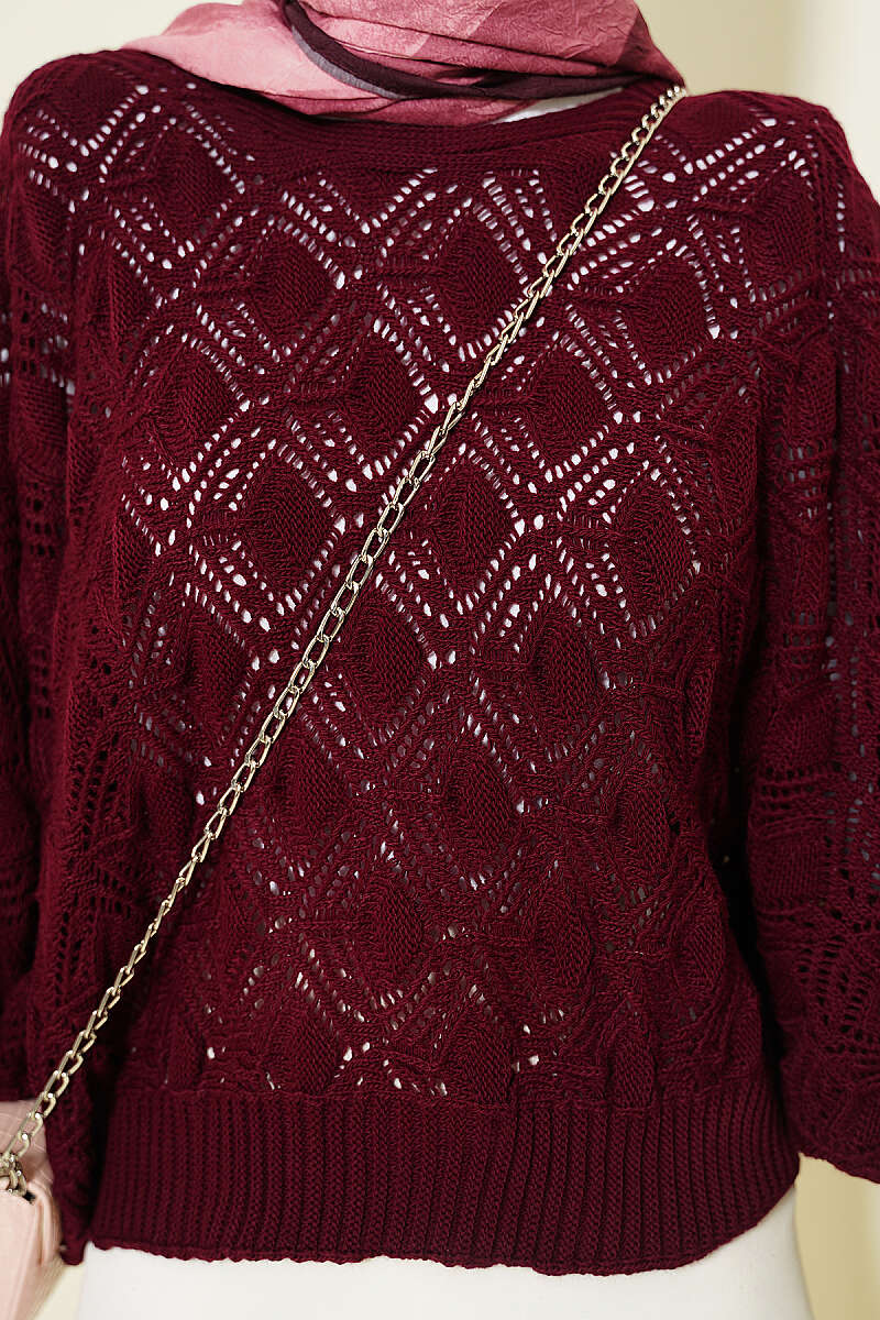 Delikli Yarasa Kol Triko Ajur Kazak Bordo