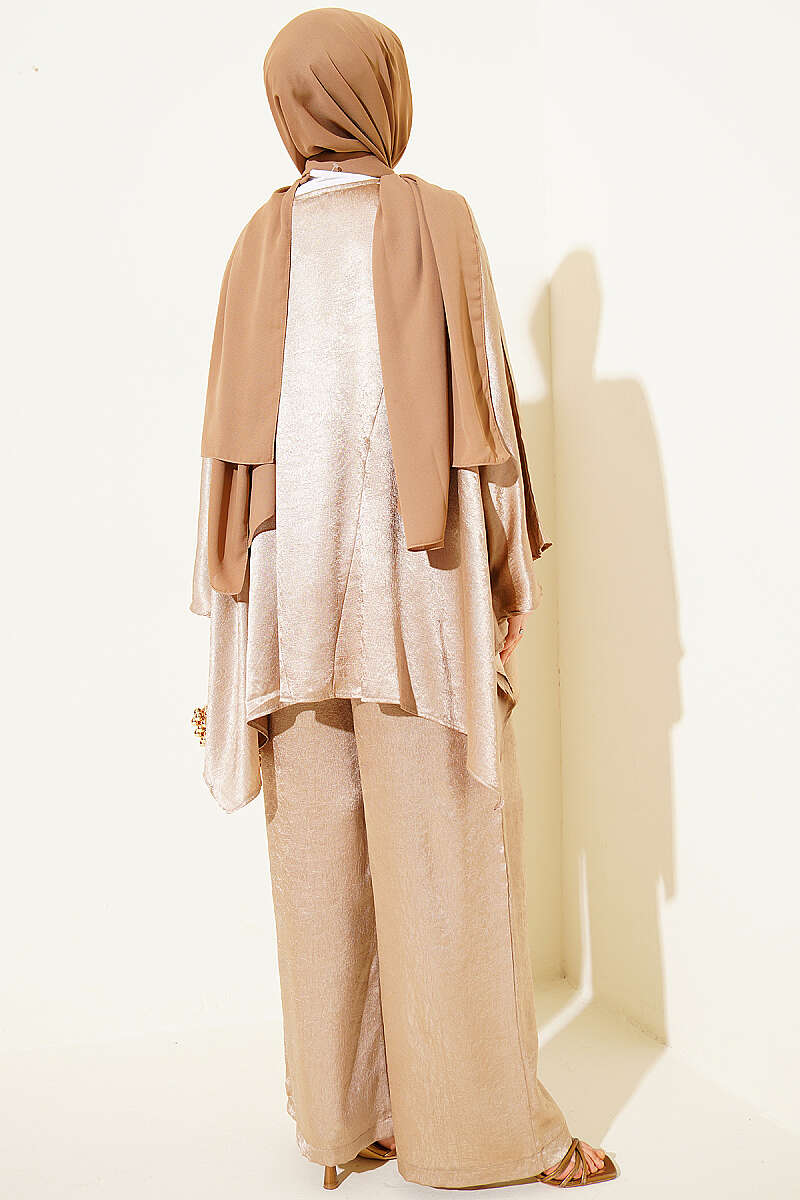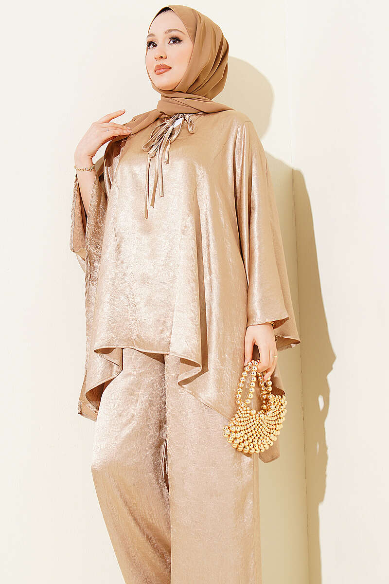 Yarasa Kol V Yaka Saten İkili Takım Kahve
