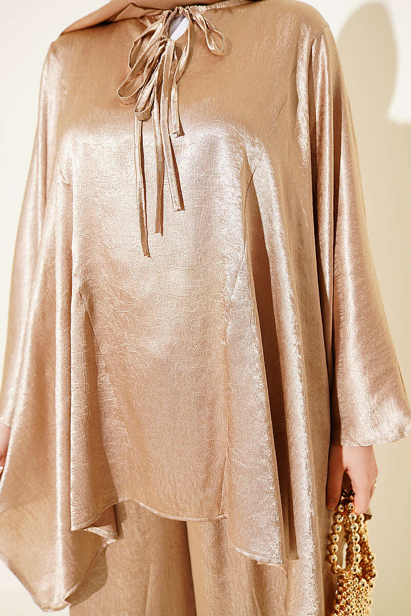 Yarasa Kol V Yaka Saten İkili Takım Bej