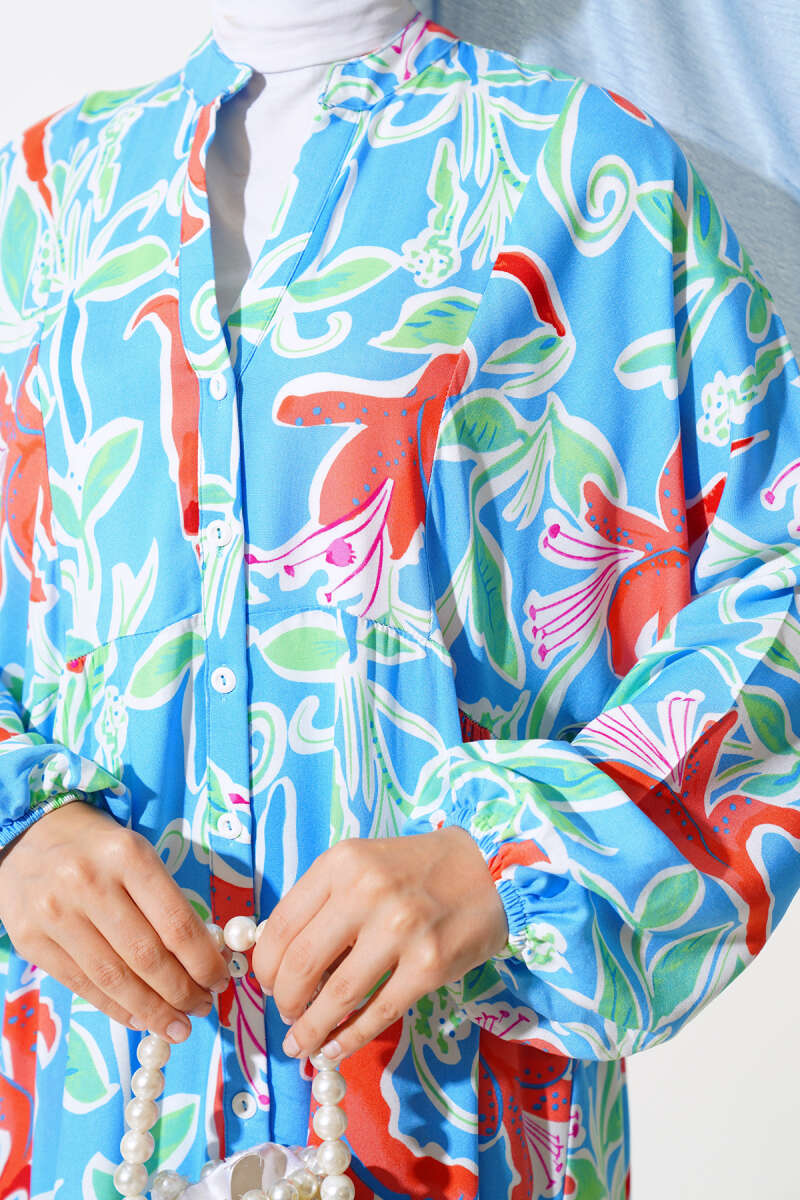 Yarı Patlı Önden Düğmeli Karışık Desenli Elbise Mavi