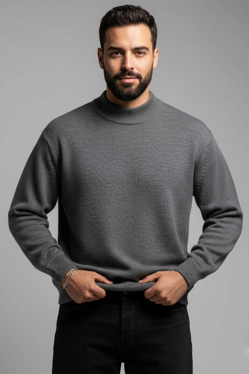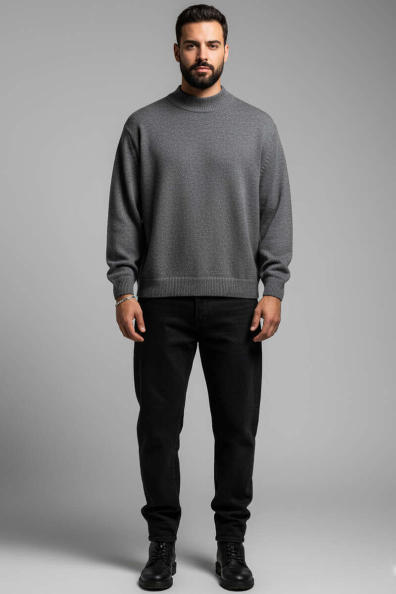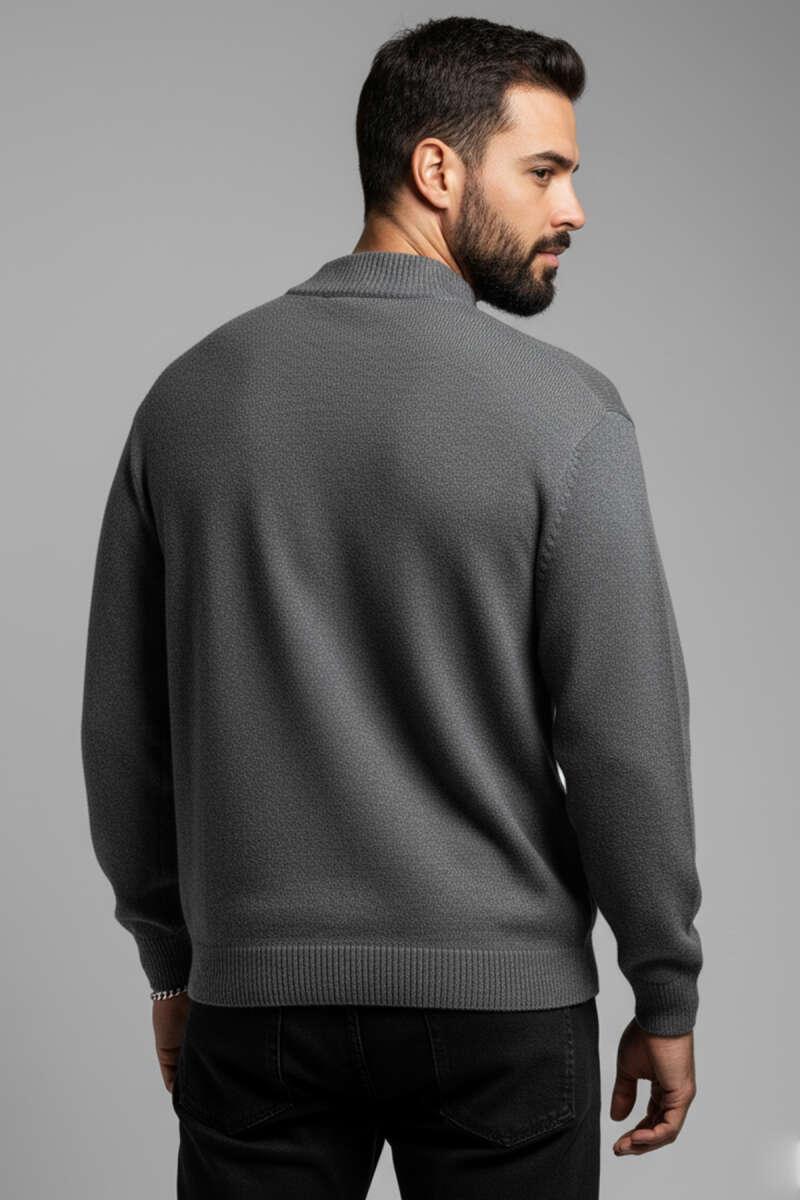 Saç Örgü Detaylı Fermuarlı Triko Kazak Gri