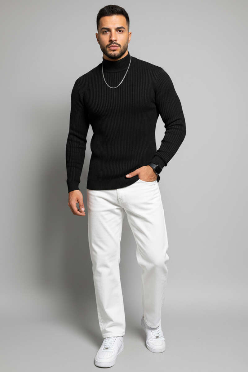 Yatak Çizgili Yumoş Triko Erkek Kazak Siyah