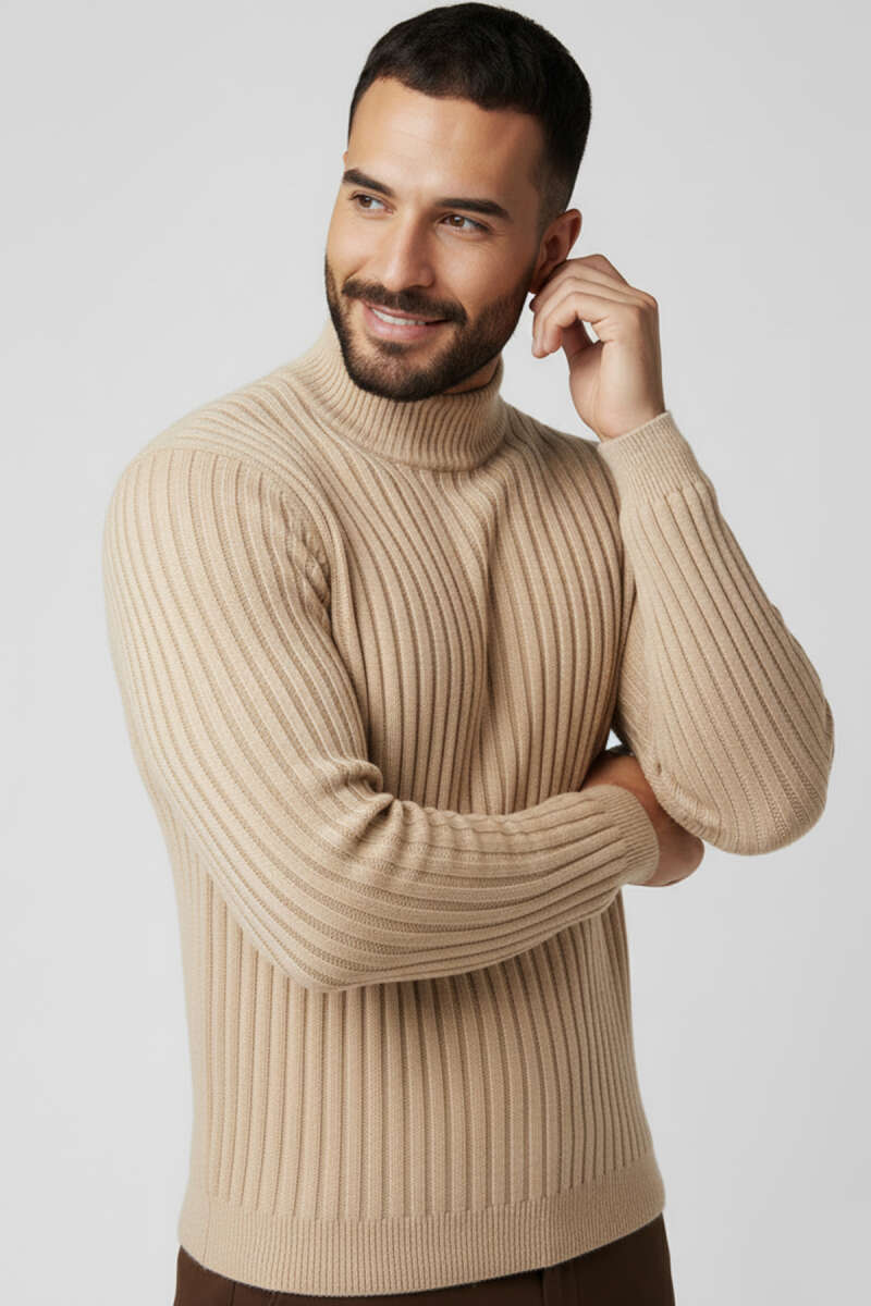 Yarım Balıkçı Yaka Fitilli Erkek Triko Kazak Bej