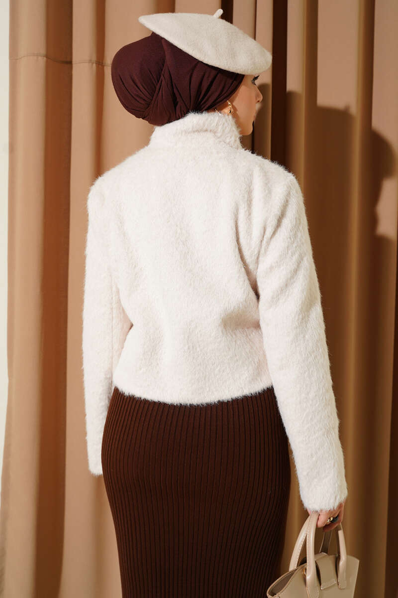 Dik Yaka Kuşaklı Sakallı Ceket Ekru